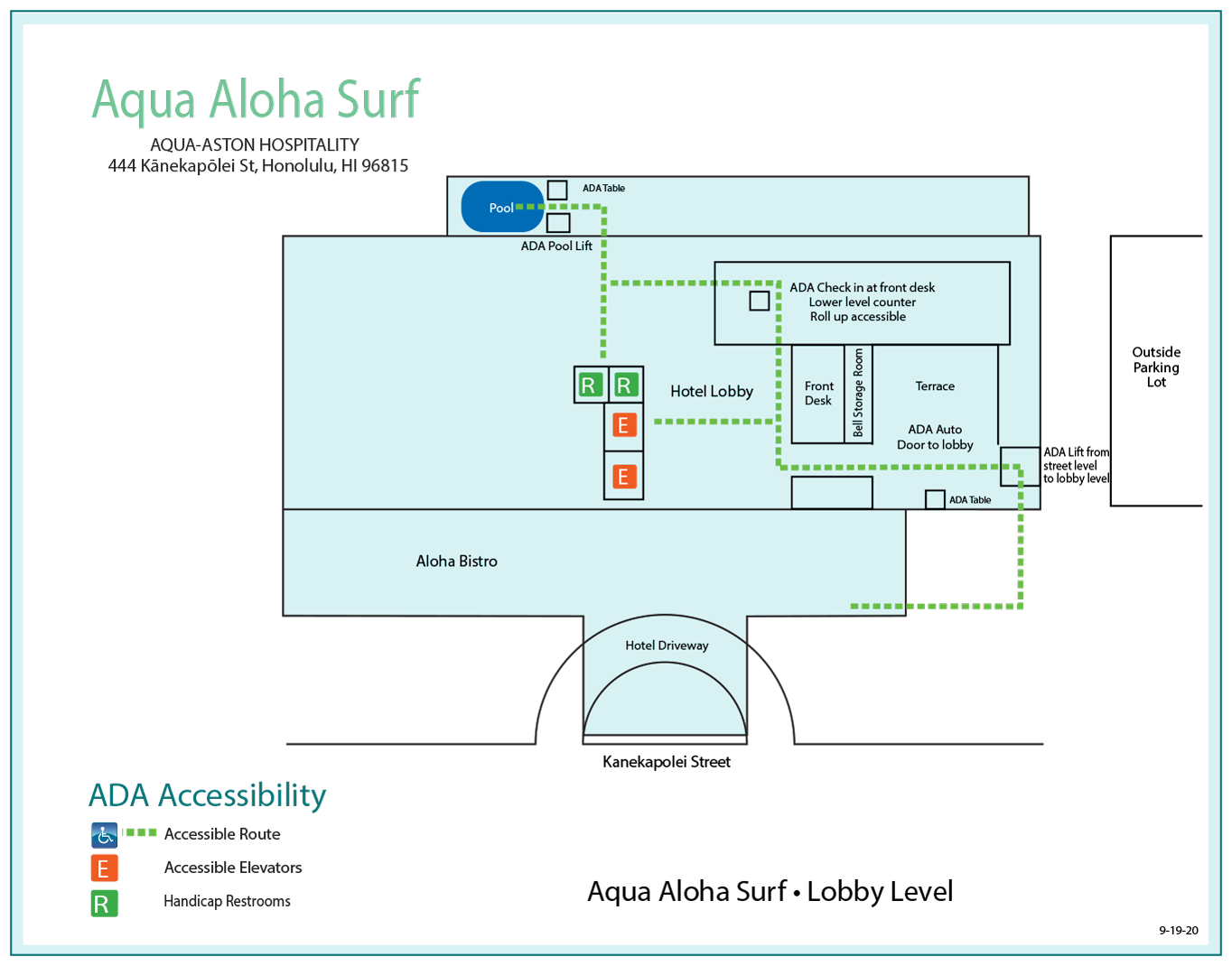 For more information about our accessibility features across the property, or if you have questions about a special service relating to a specific disability need, please call 1-855-945-4092. Rooms at Aqua Aloha Surf Waikiki are individually owned and controlled and therefore, rooms with accessible features are not available.
