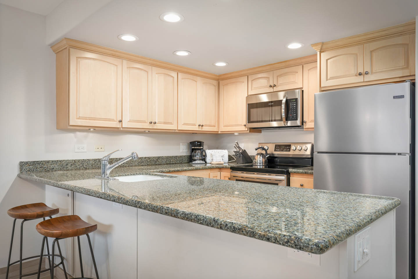 air conditioning (living room), ceiling fans (living room), full kitchen with a blender, coffee maker, dishwasher, microwave, refrigerator, and stovetop; hair dryer, in-room safe, iron/ironing board, private balcony, telephone with voicemail, washer/dryer