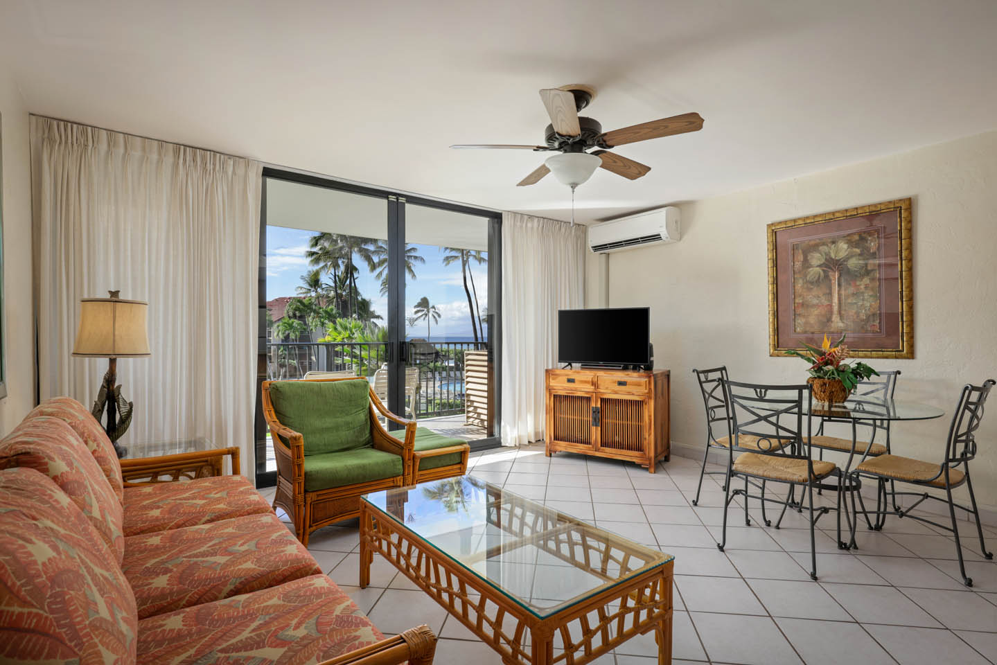 air conditioning (living room), ceiling fans (living room), full kitchen with a blender, coffee maker, dishwasher, microwave, refrigerator, and stovetop; non-smoking, hair dryer, in-room safe, iron/ironing board, private balcony, telephone with voicemail, washer/dryer