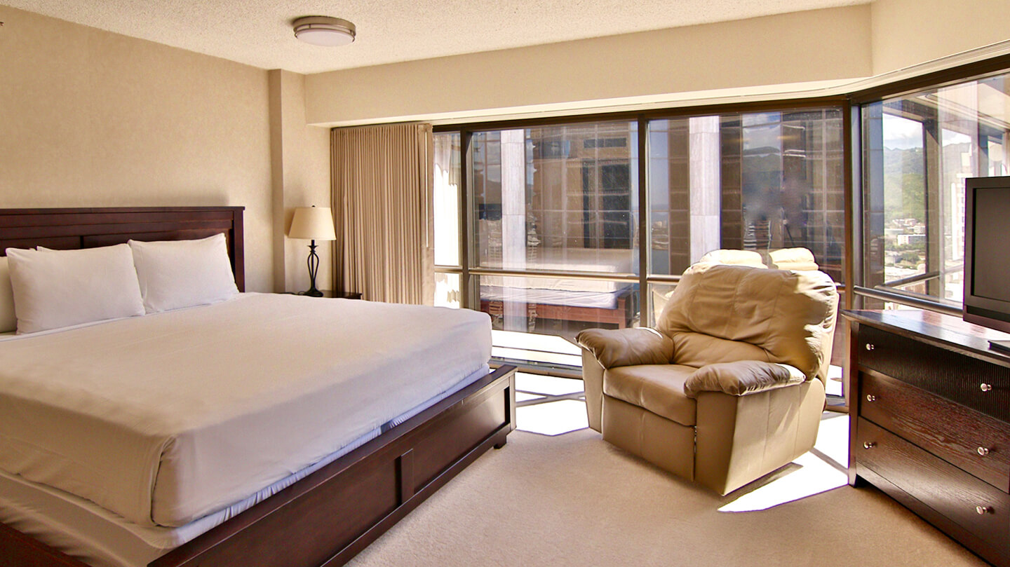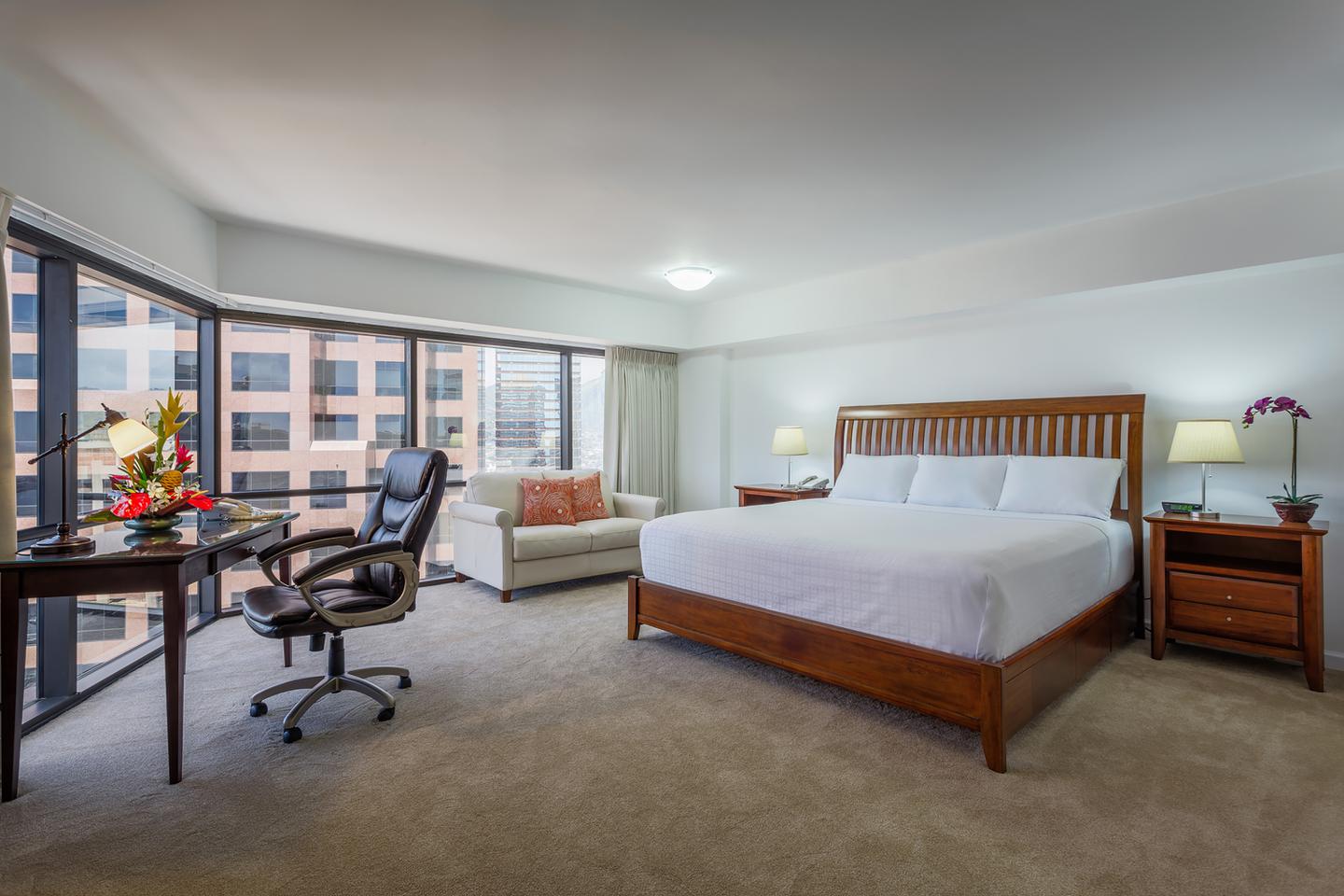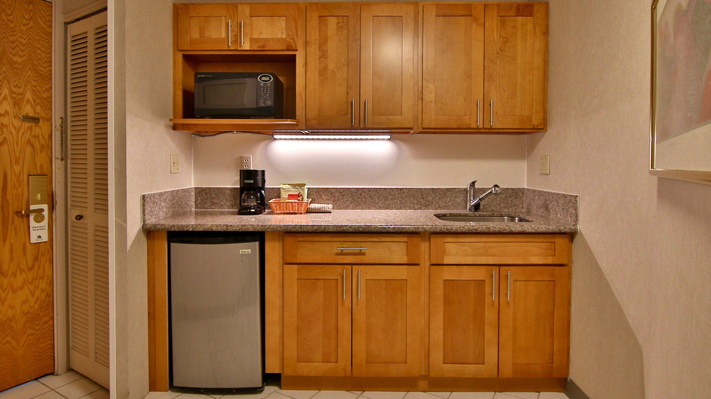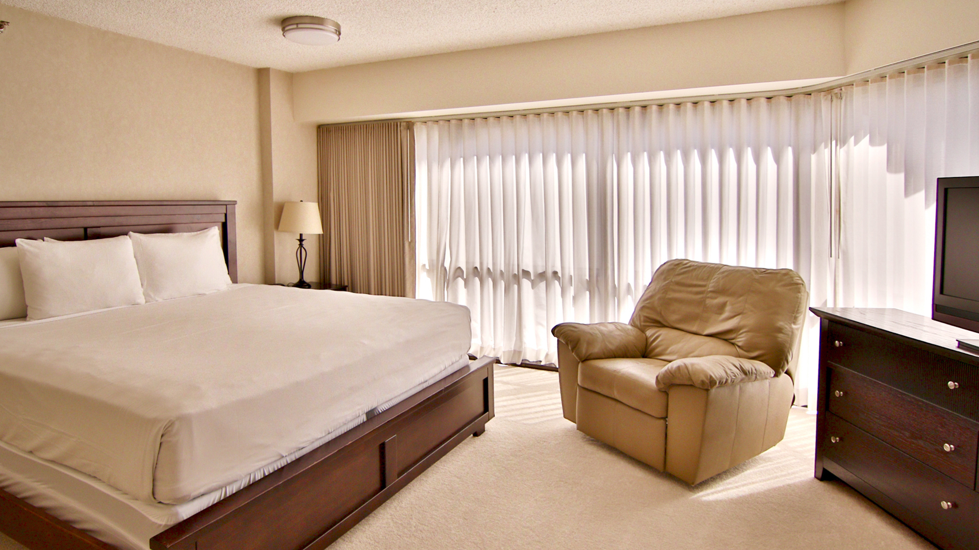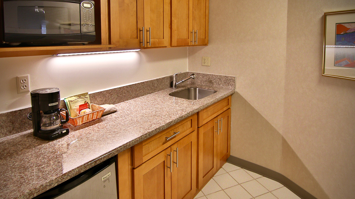 Unwind after a long day and enjoy mountain views through floor-to-ceiling windows and a comfortable living area in our Deluxe Business Suite. Thoughtful amenities include central air conditioning, a wet bar, microwave, mini-refrigerator, and WiFi internet access.