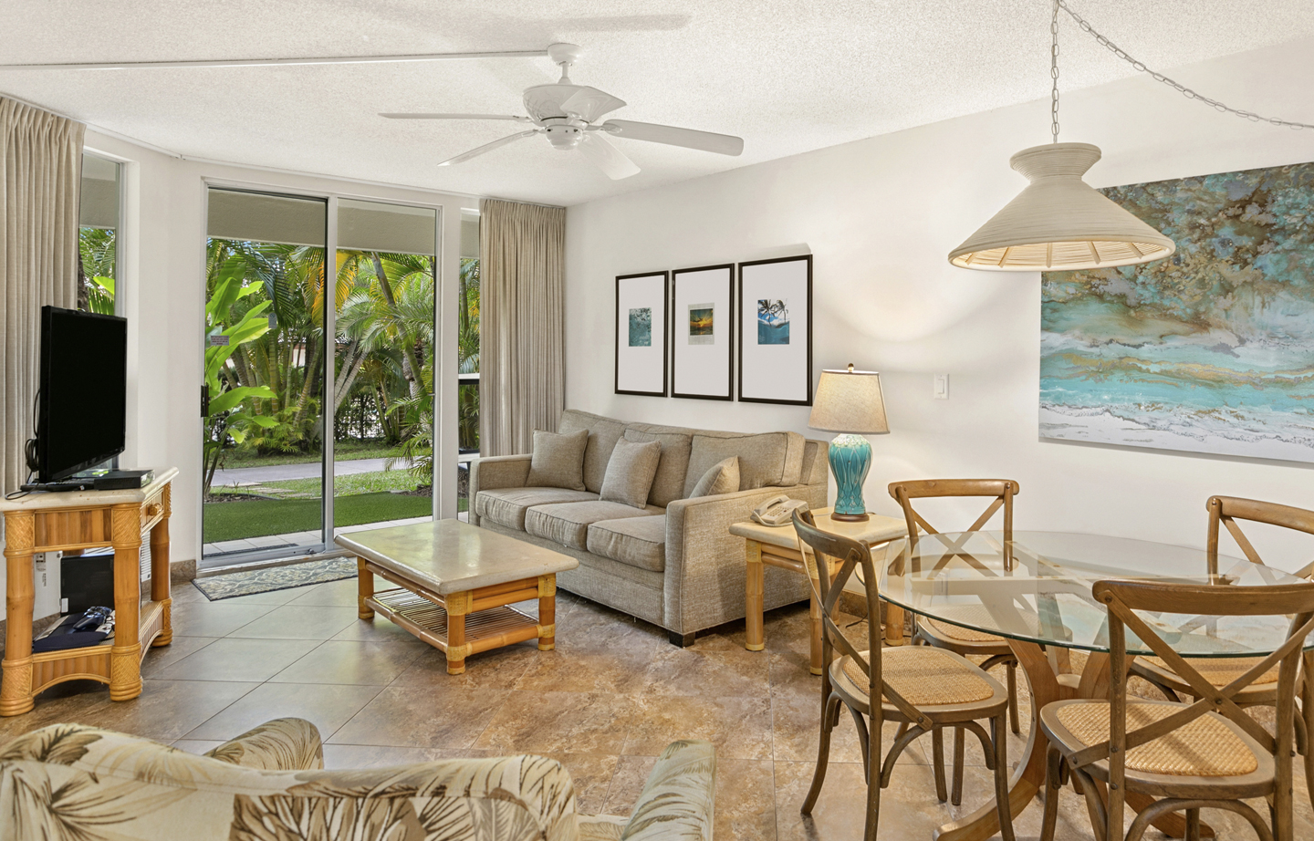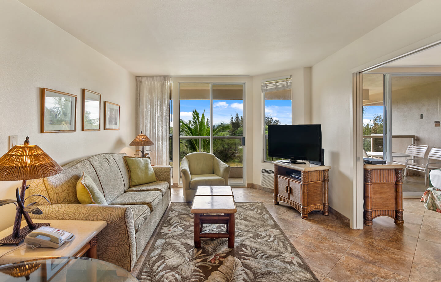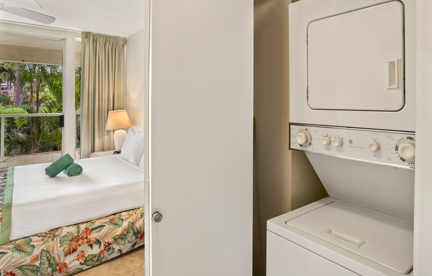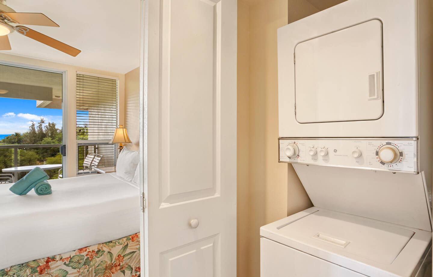 Upgrade to a one bedroom suite featuring upgraded furnishings and decor. Unwind in a spacious living area or step onto the private balcony to soak in lush garden views and the warm Maui sunshine. Each suite includes a full kitchen and in-unit washer/dryer for added convenience.