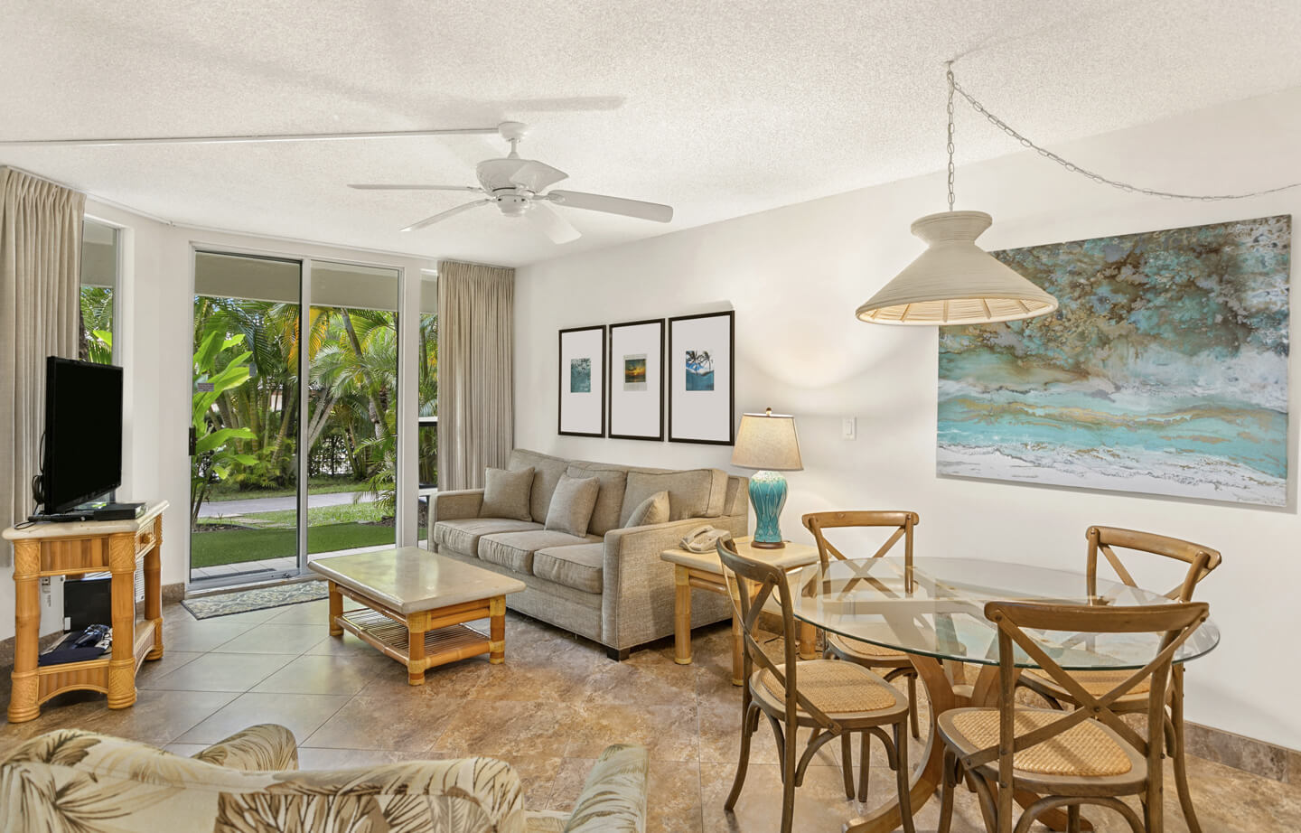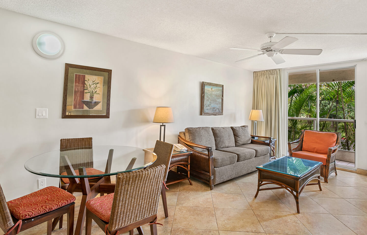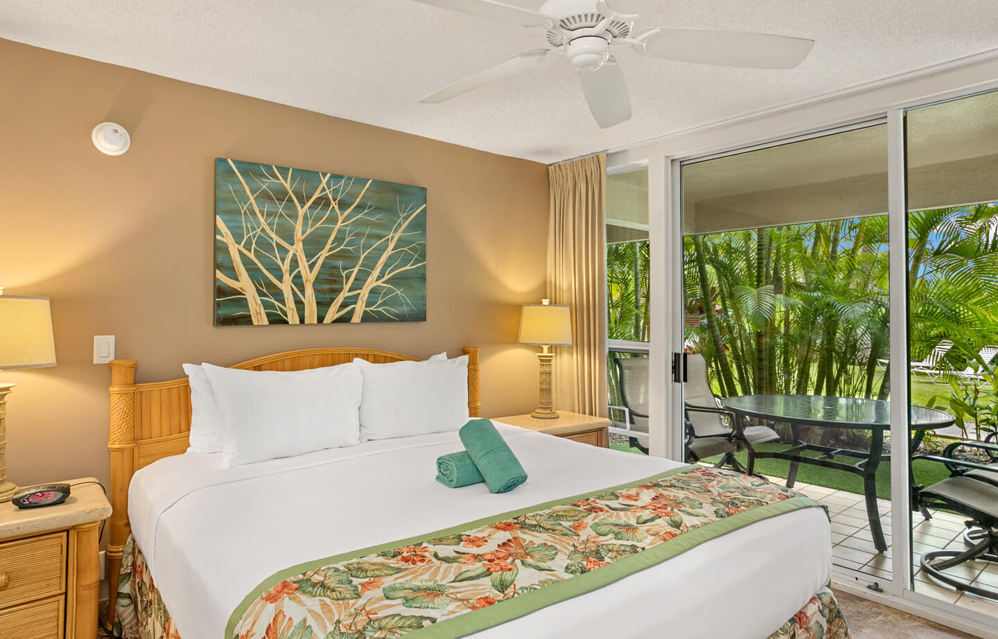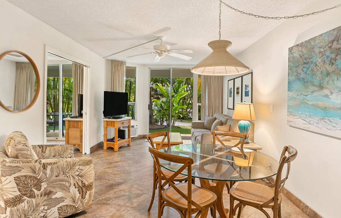Upgrade to a one bedroom suite featuring upgraded furnishings and decor. Unwind in a spacious living area or step onto the private balcony to soak in lush garden views and the warm Maui sunshine. Each suite includes a full kitchen and in-unit washer/dryer for added convenience.