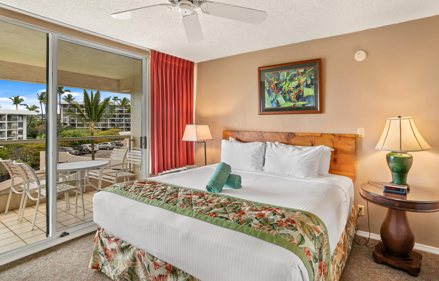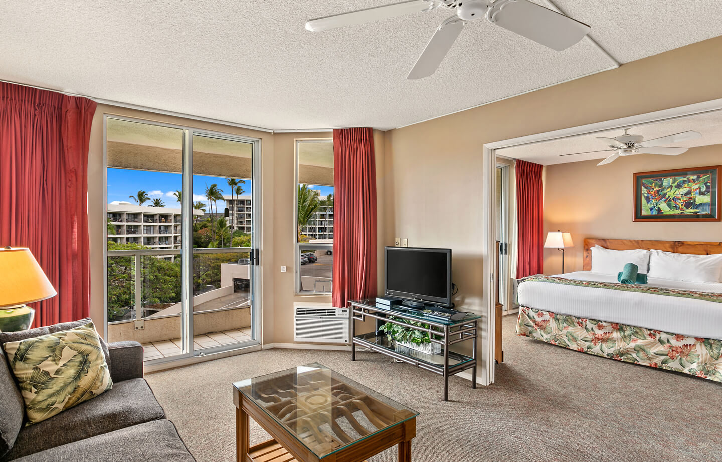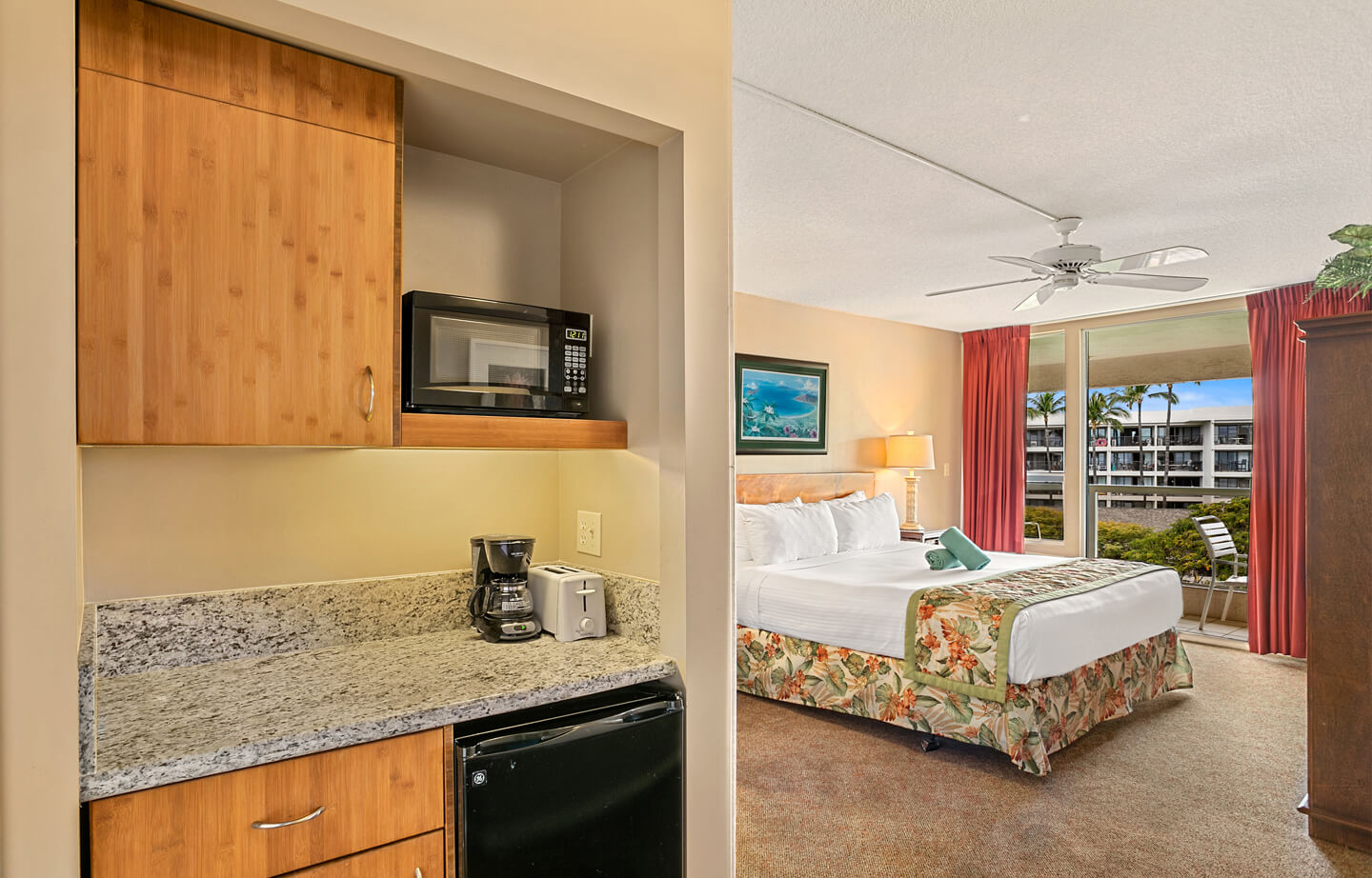 Deluxe hotel guest rooms offer upgraded furnishings and views of landscaped greenery from a private balcony. A short stroll takes you to Kamaole Beach or the on-site pool to bask in the warm Maui sun. Rooms features include a mini-refrigerator, coffee maker, and microwave upon request.