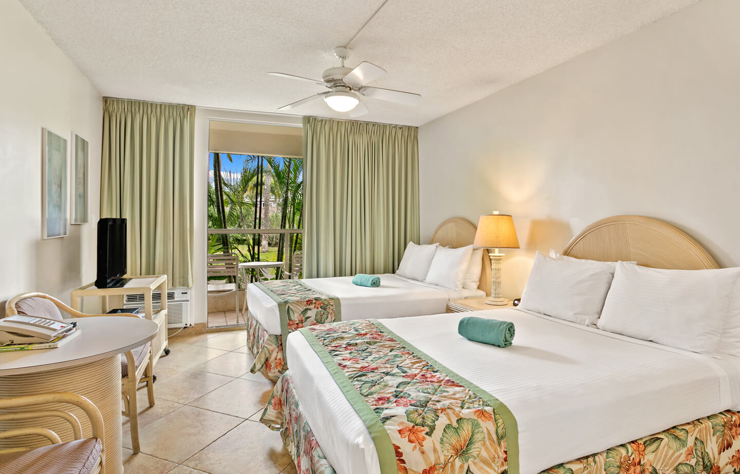 Affordable Maui condos in Kihei, Aston at the Maui Banyan offers quality in-room amenities at great value. Set on lush tropical landscaping, feel at home in standard hotel rooms or spacious suites with full kitchens and in-unit washer/dryers. All accommodations feature a private balcony and WiFi internet access. There are no extra charges for additional adults.