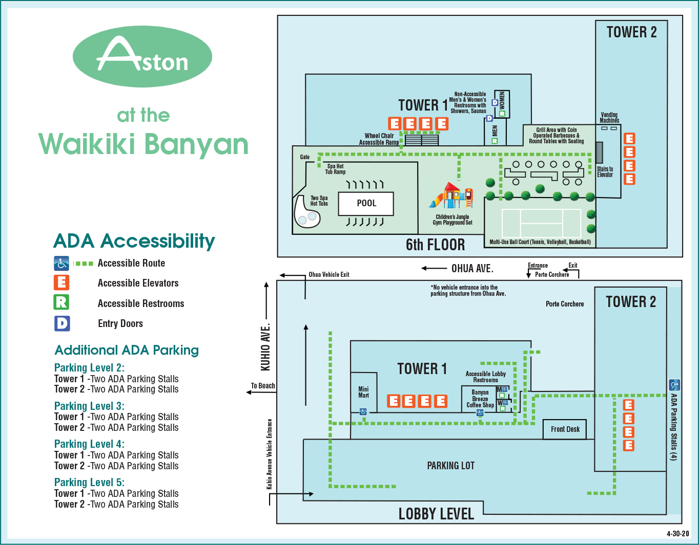For more information about our accessibility features across the property, or if you have questions about a special service relating to a specific disability need, please call 1-855-945-4092. Rooms at Aston at the Waikiki Banyan are individually owned and controlled and therefore, rooms with accessible features are not available.