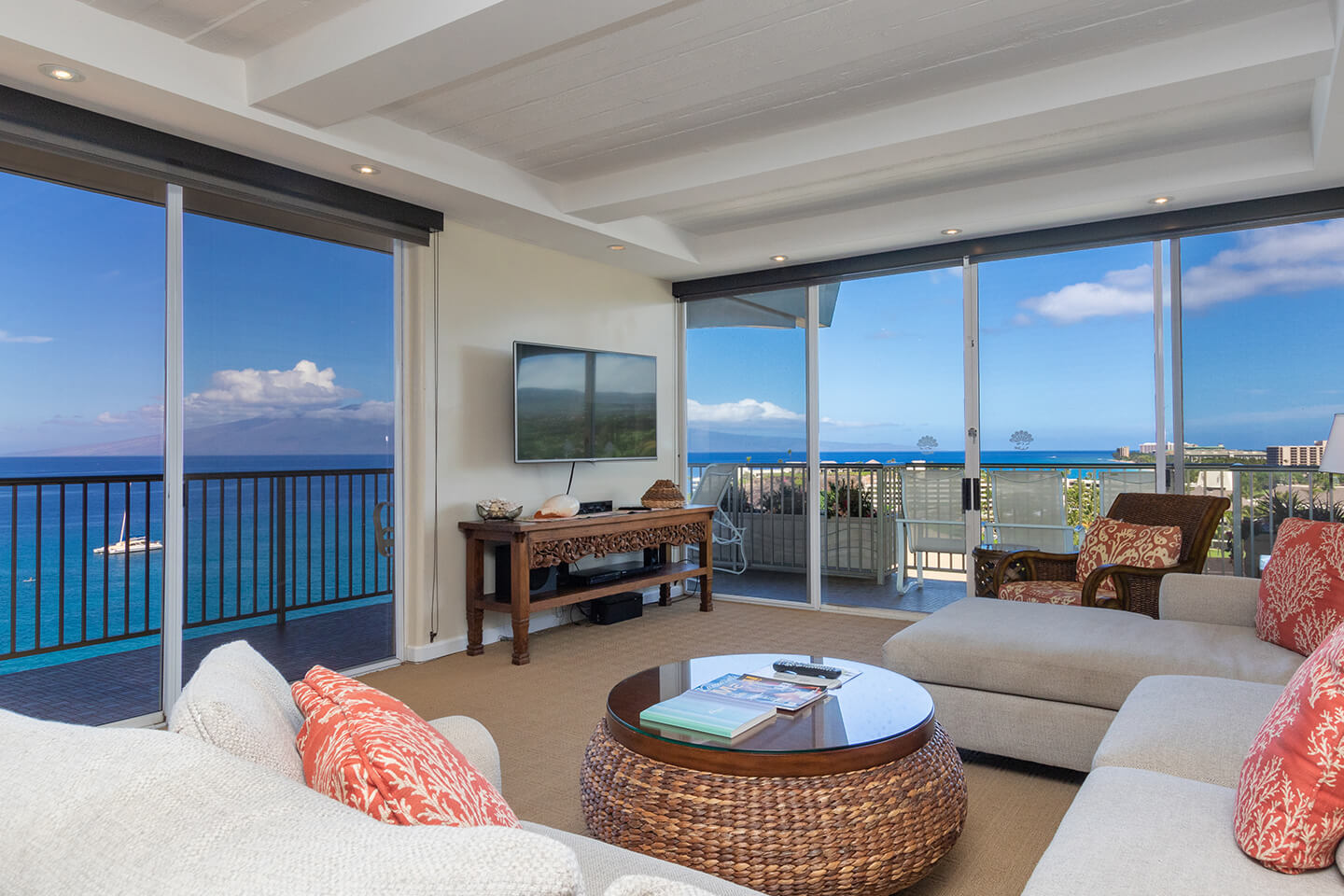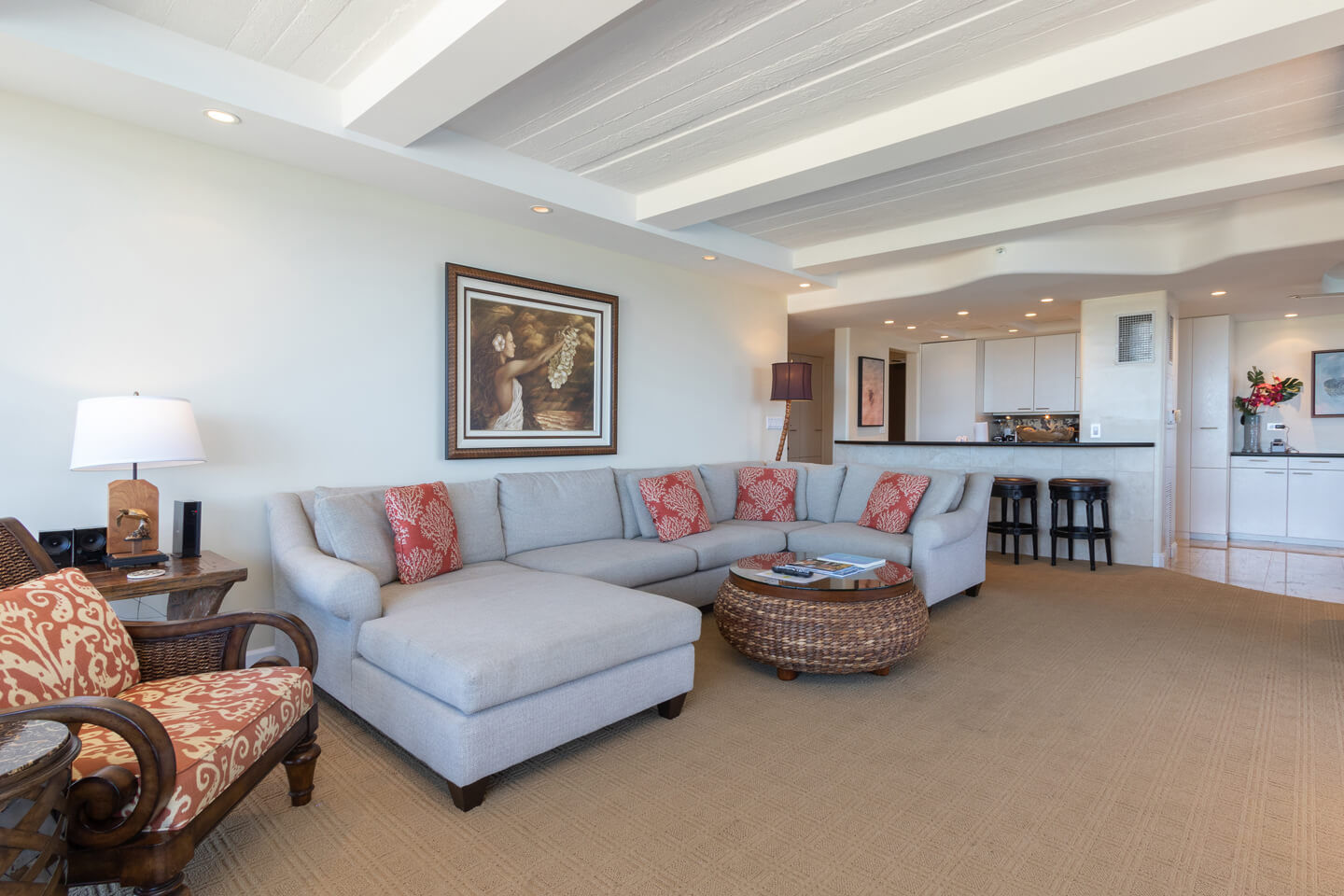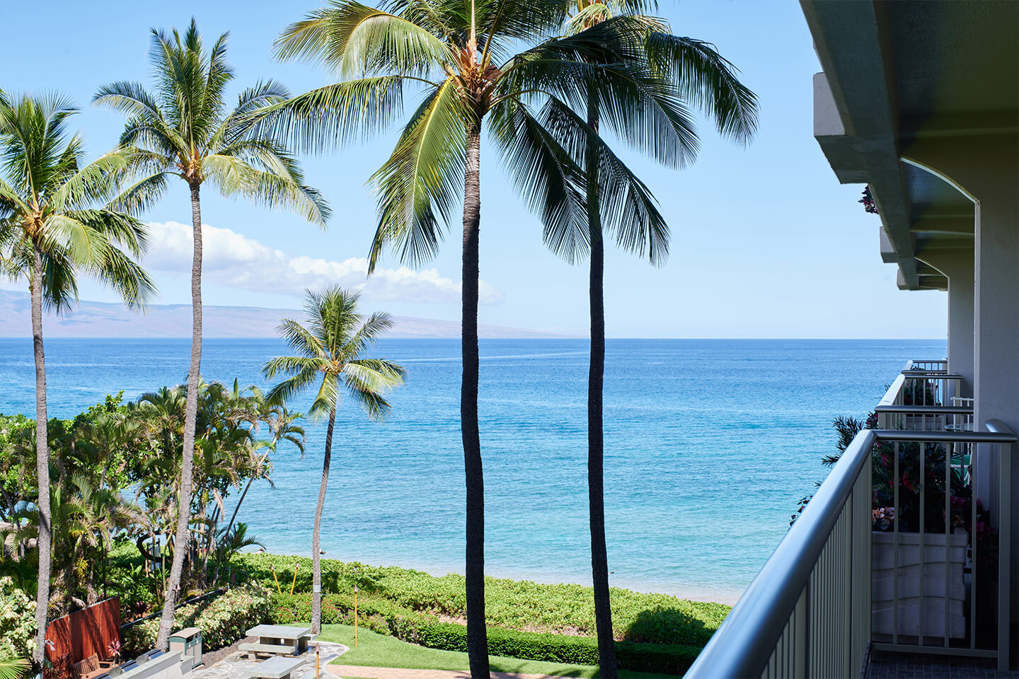 Perched above the beachfront from the best suite in the house—this is a dream Maui vacation come true. Savor serene oceanfront views of the Pacific and a large private wraparound balcony for lounging. Suite features two bedrooms, two bathrooms, a living area, and a fully equipped kitchen.
