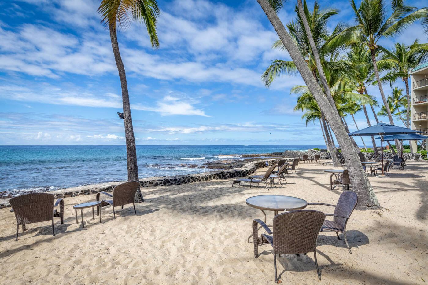 Two lounge chairs near the shore break facing the ocean under some coconut trees at the Aston Kona by the Sea