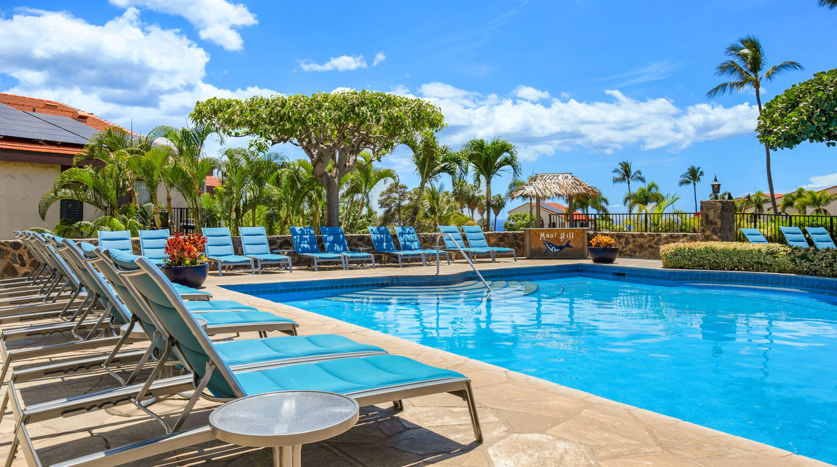 Pool at the Maui Hill with blue padded lounge chairs, landscaped with lush green palm trees and colorful bushes and accommodation building units in the background
