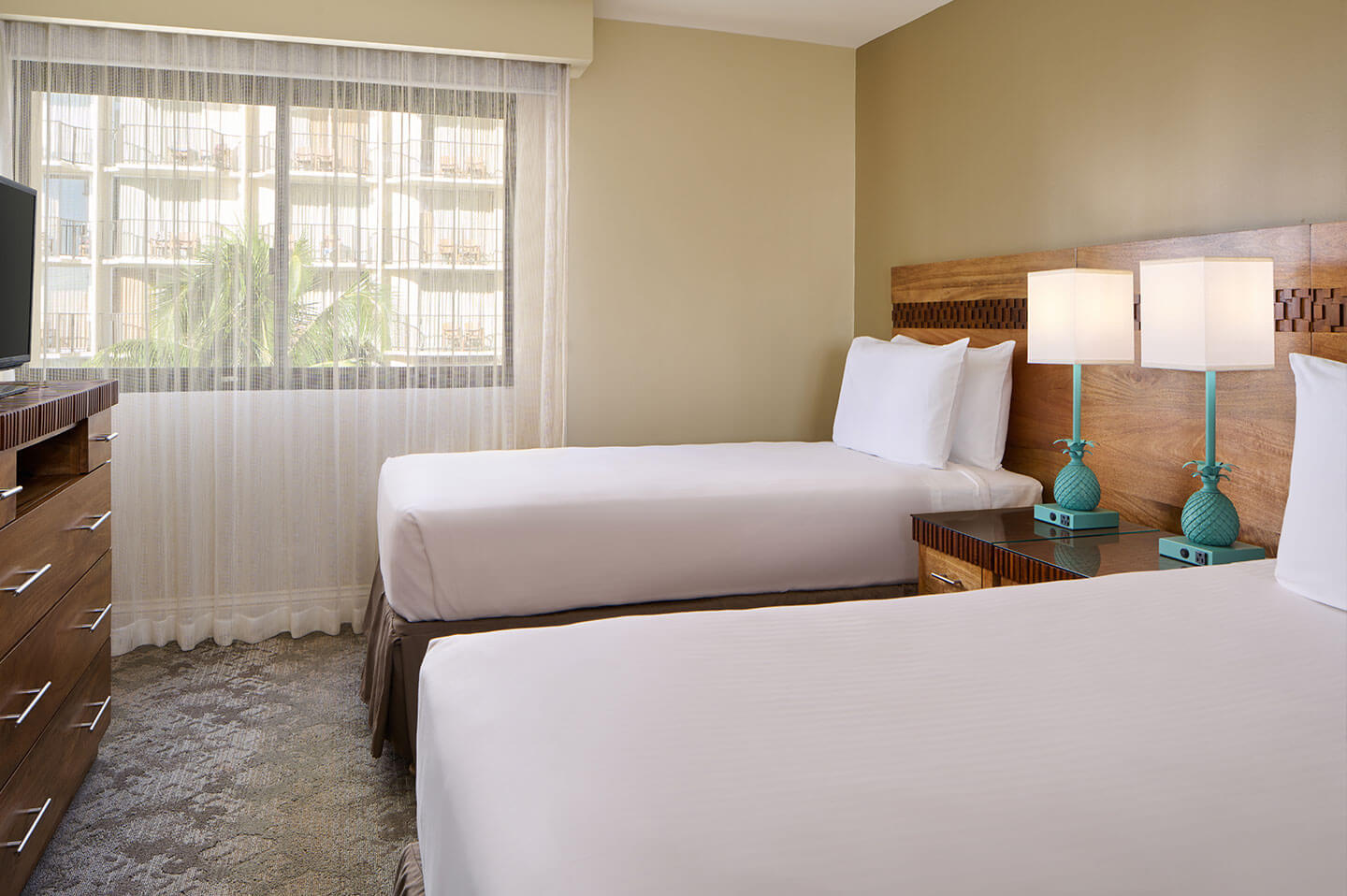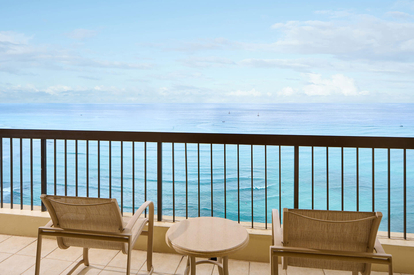 Recently renovated partial ocean view suites located on the lower tower floors feature private furnished balconies overlooking Waikiki Beach. These two-bedroom suites are ideal for families and small groups with a spacious living area, fully equipped kitchen, washer/dryer, and central air conditioning for added comfort.