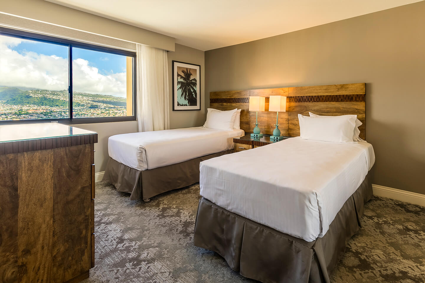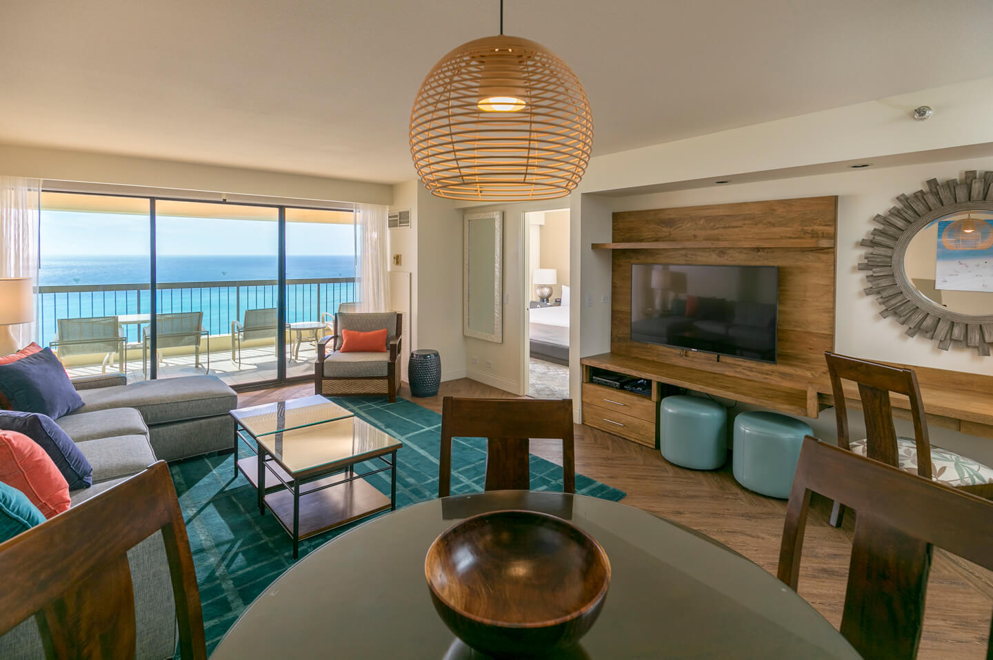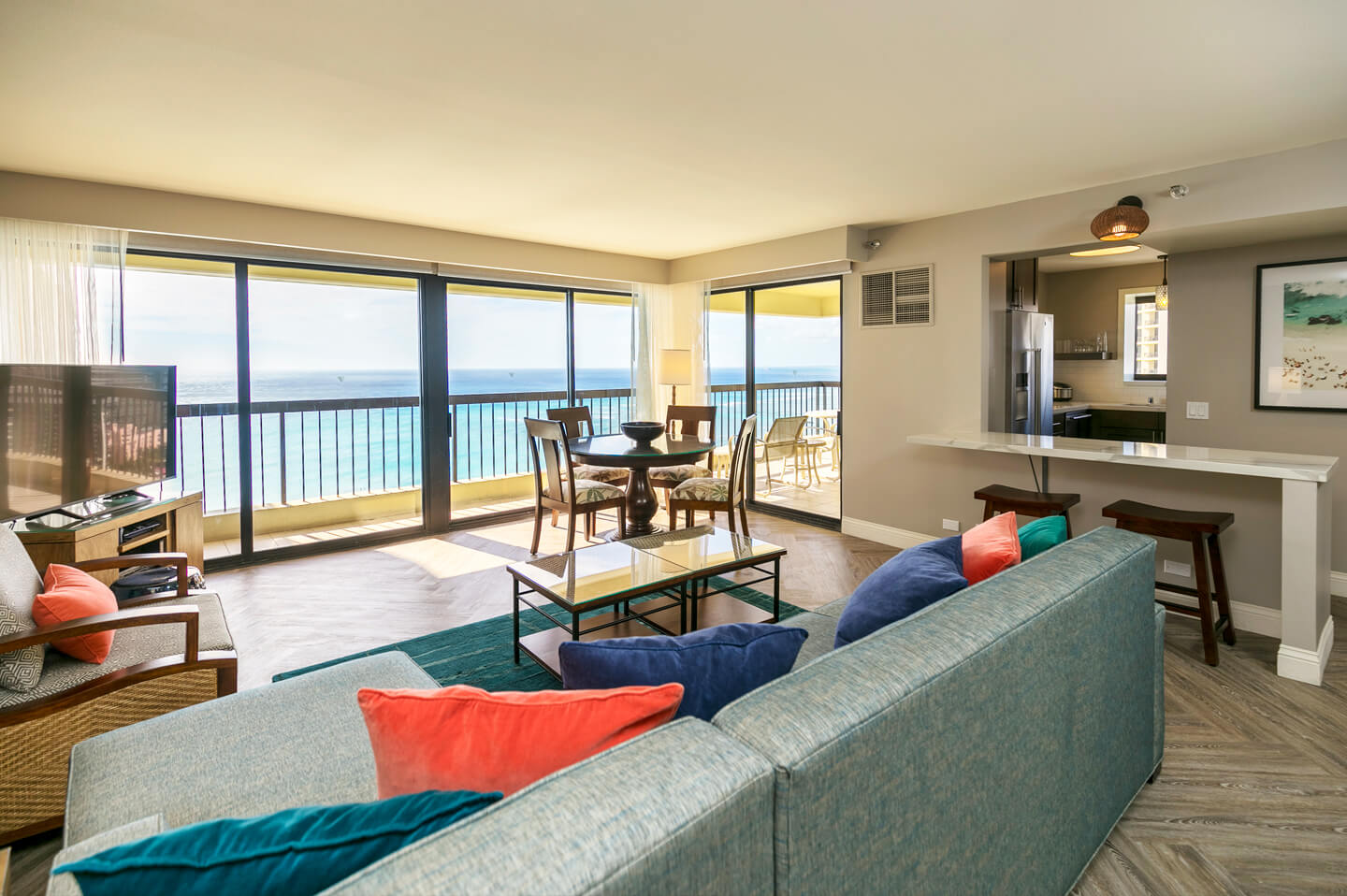 Near the top of the tower on floors 37-39, the two-bedroom penthouse suites offer unobstructed oceanfront views of Waikiki Beach and the Pacific Ocean. Each unit features central air conditioning, two bedrooms, two bathrooms, fully equipped gourmet kitchens, and in-suite washer/dryer. This luxe suite is the ideal way to spend your dream vacation in Hawaii.