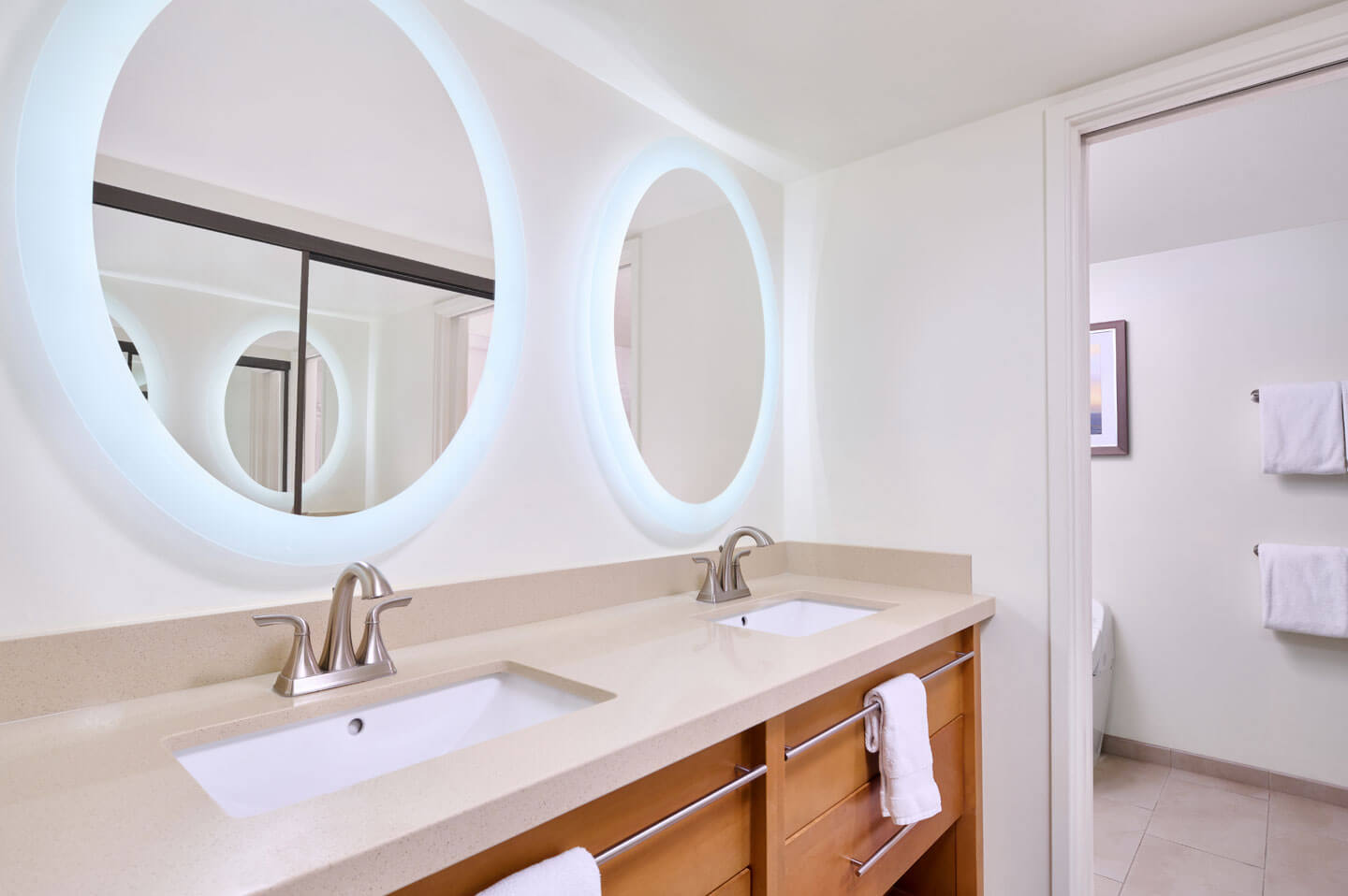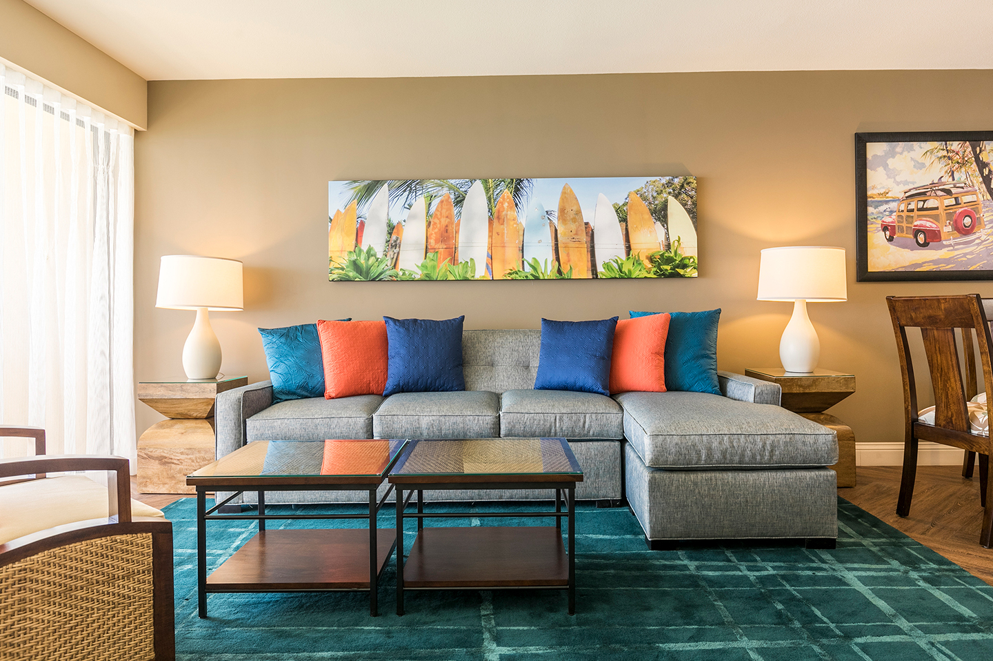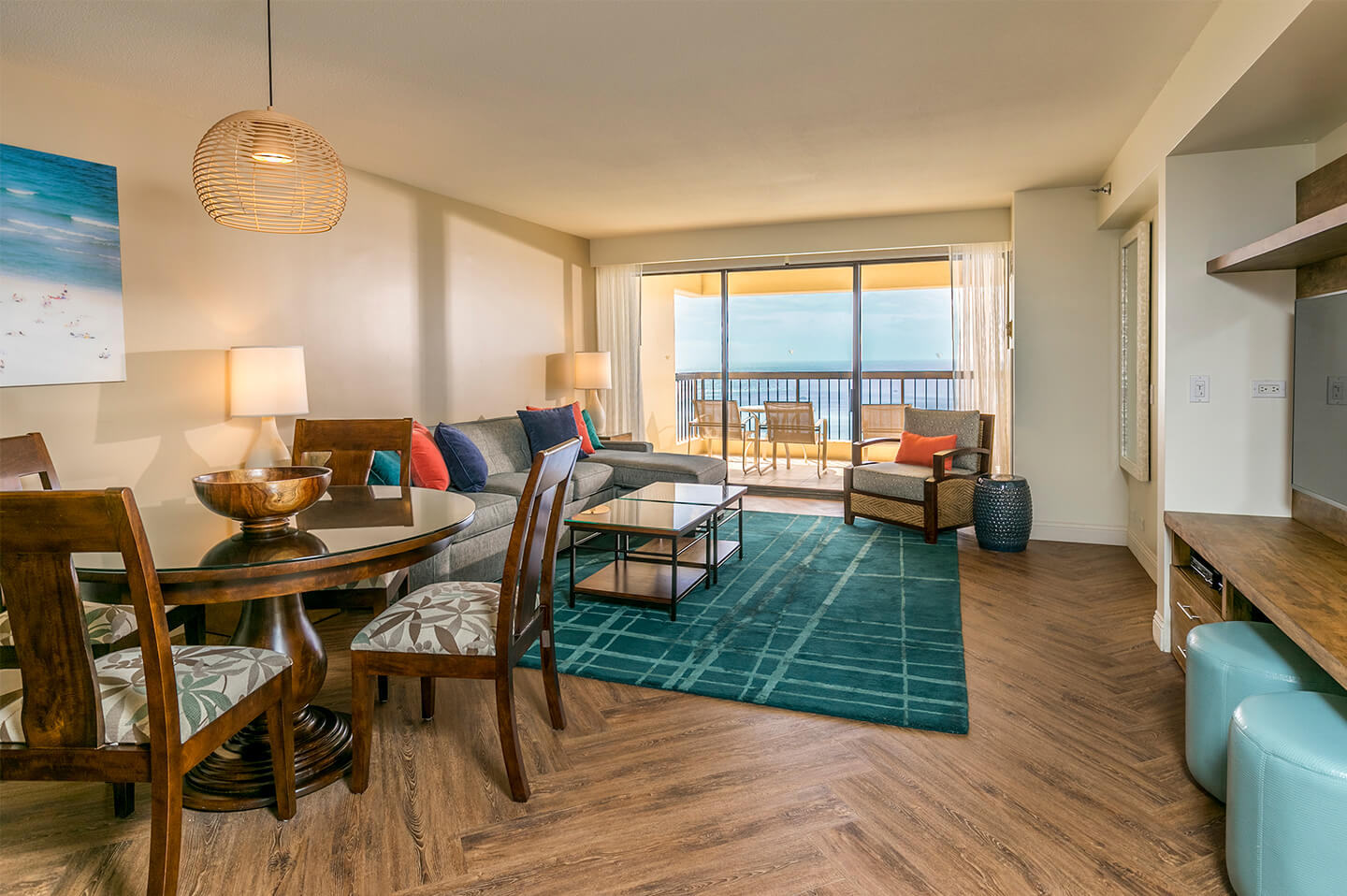 Near the top of the tower on floors 37-39, the two-bedroom penthouse suites offer unobstructed oceanfront views of Waikiki Beach and the Pacific Ocean. Each unit features central air conditioning, two bedrooms, two bathrooms, fully equipped gourmet kitchens, and in-suite washer/dryer. This luxe suite is the ideal way to spend your dream vacation in Hawaii.