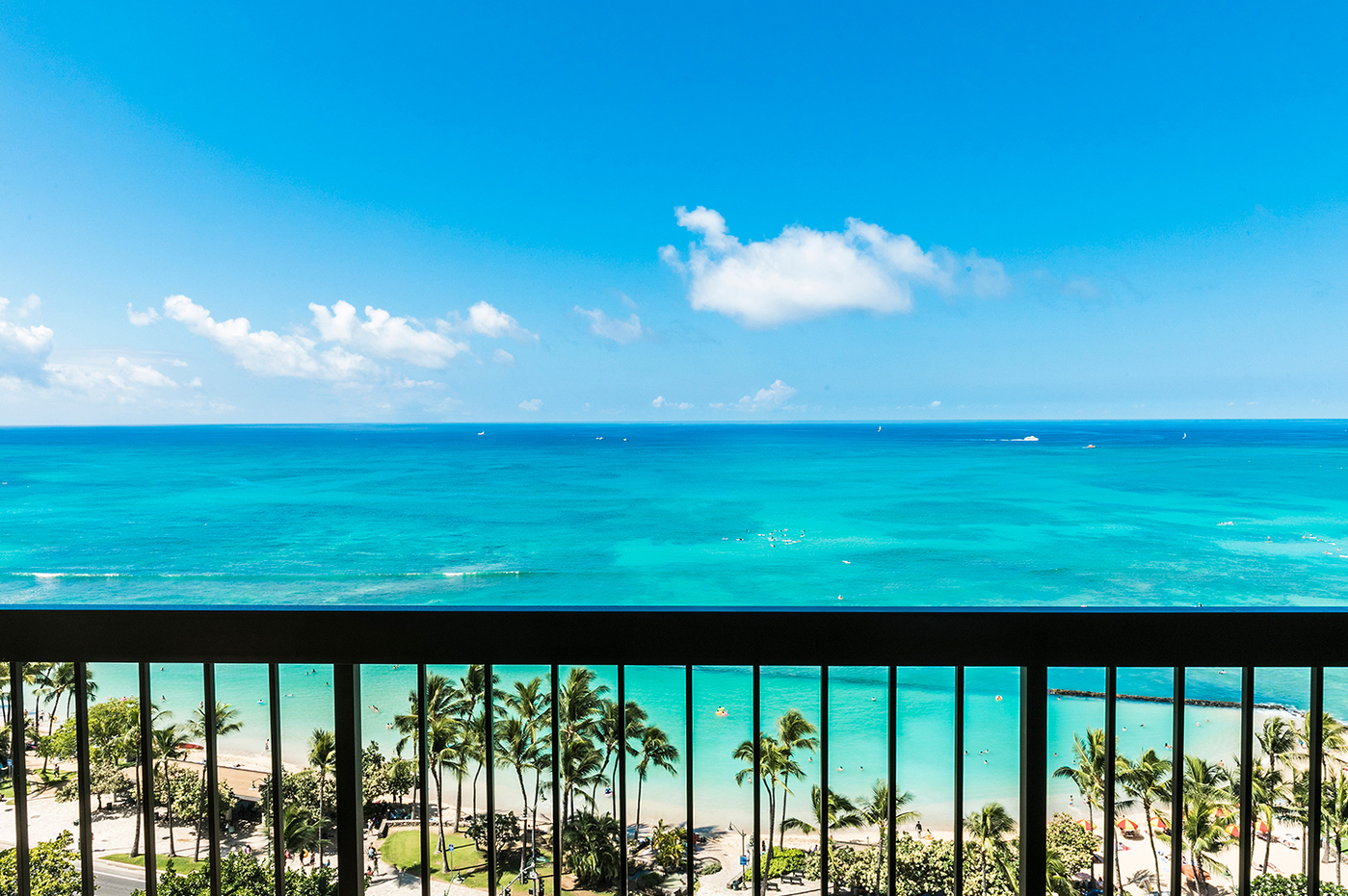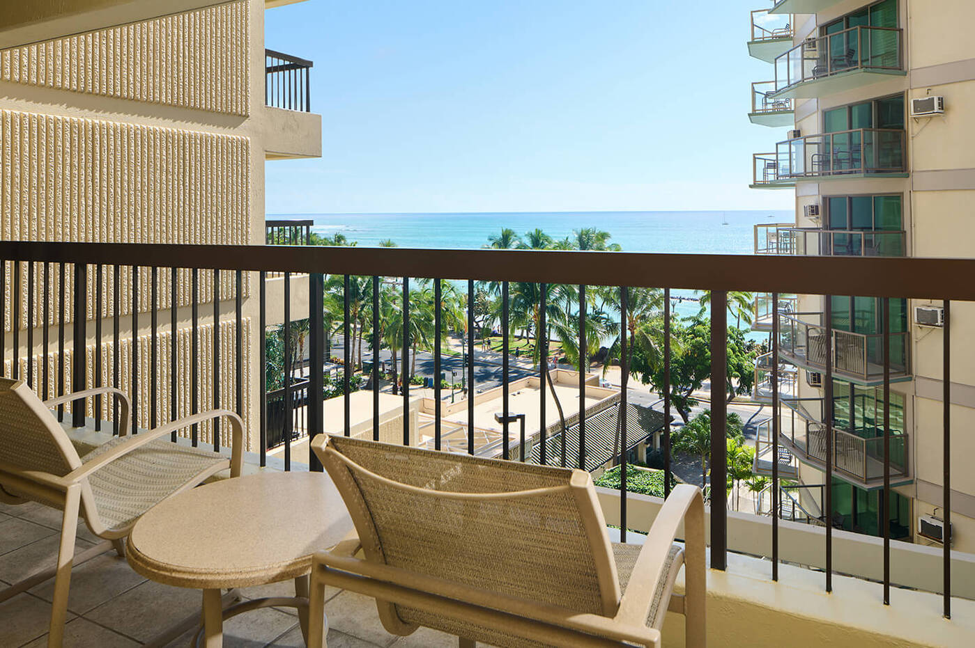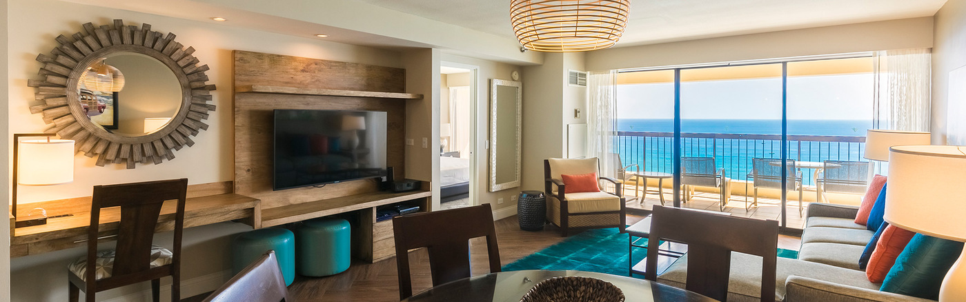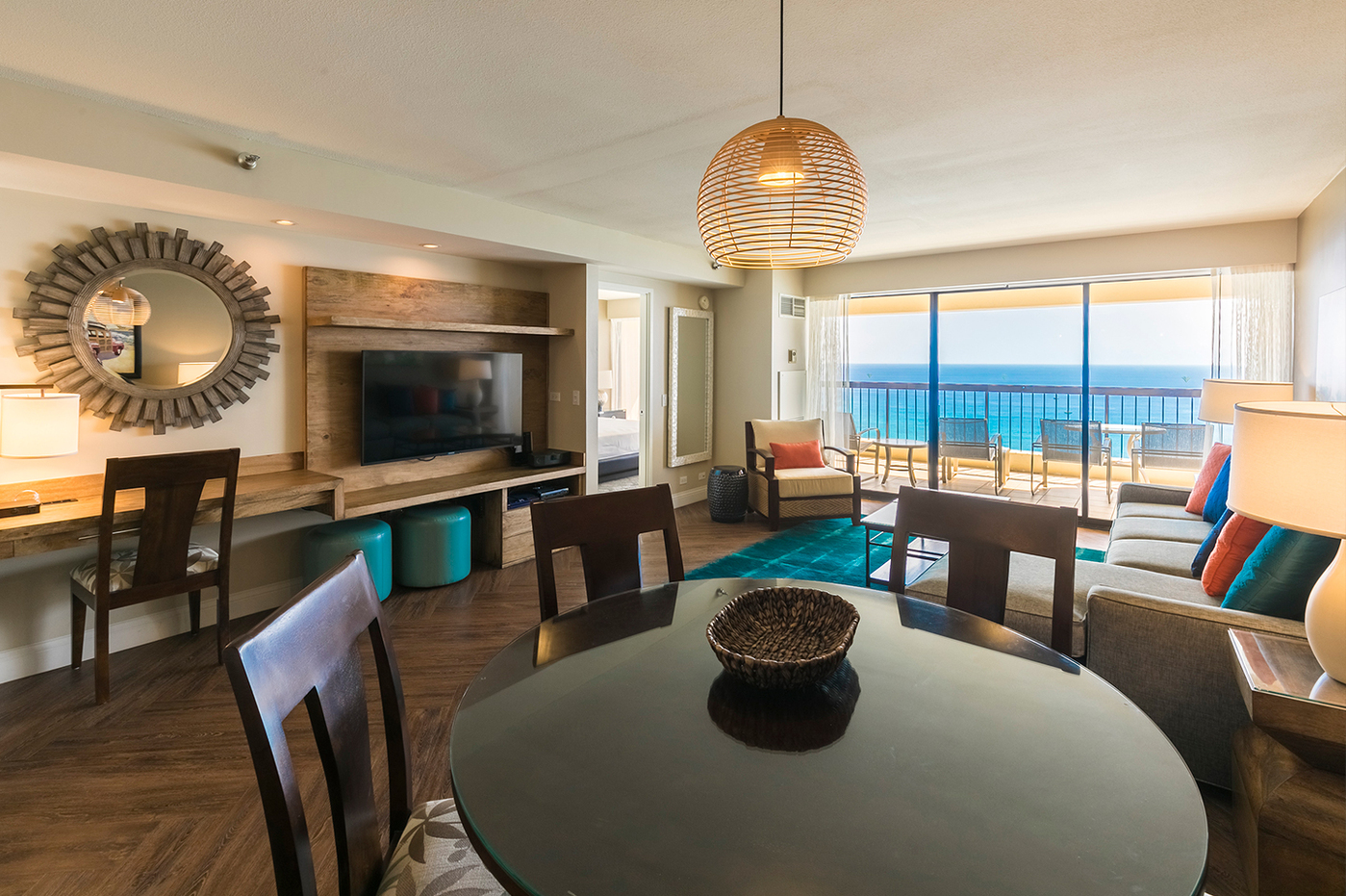 Located on the upper tower floors 25-36, these two-bedroom premium oceanfront suites offer spectacular views of the Pacific Ocean and overlook world-famous Waikiki Beach. Each suite features a private furnished balcony, central air conditioning, separate living area, two bathrooms, washer/dryer, and a fully equipped modernized kitchen.