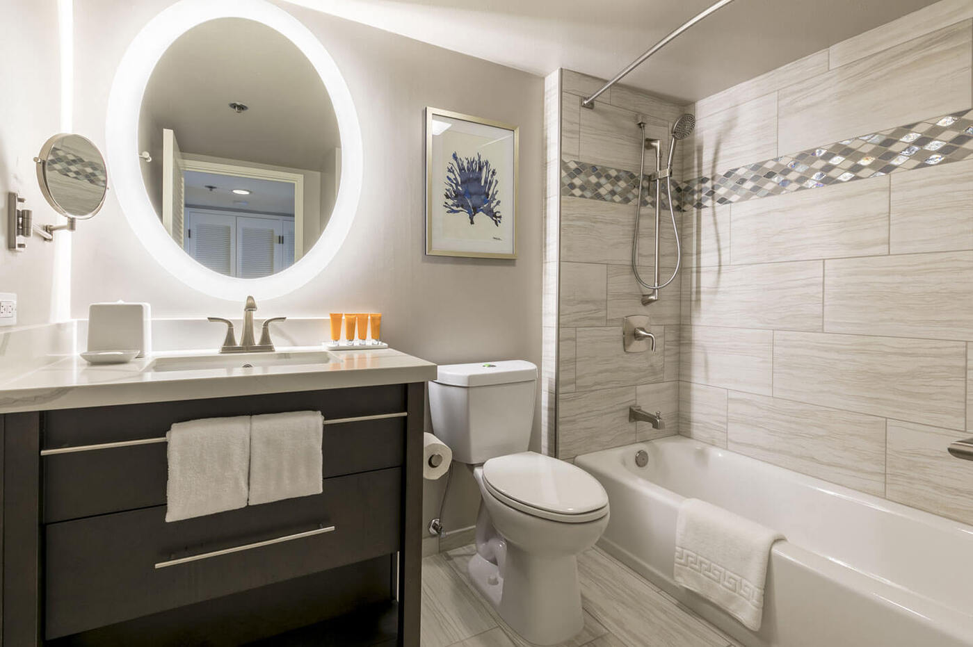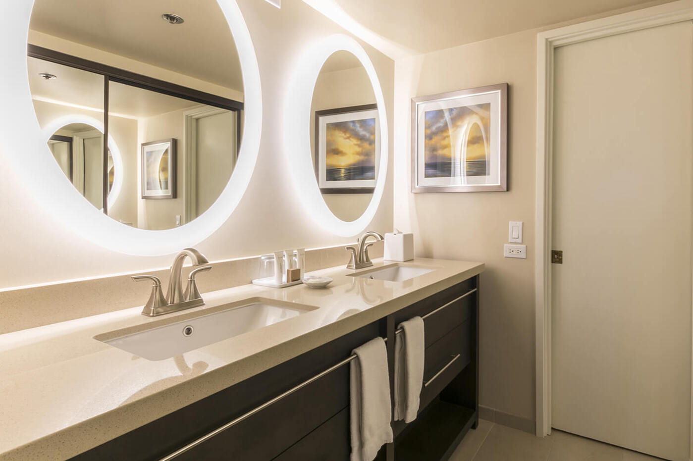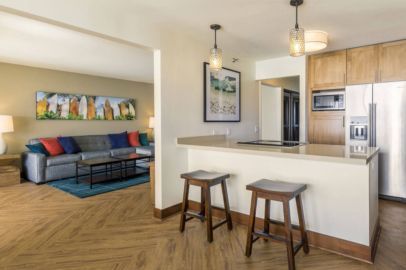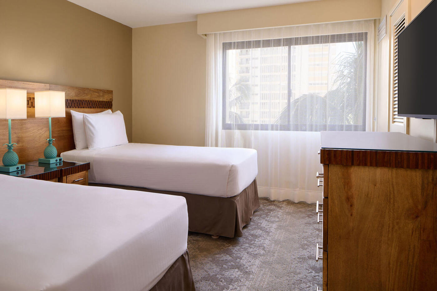 Located on the upper tower floors 25-36, these two-bedroom premium oceanfront suites offer spectacular views of the Pacific Ocean and overlook world-famous Waikiki Beach. Each suite features a private furnished balcony, central air conditioning, separate living area, two bathrooms, washer/dryer, and a fully equipped modernized kitchen.