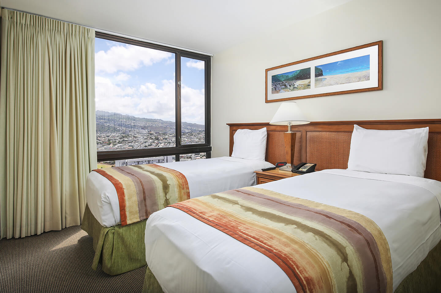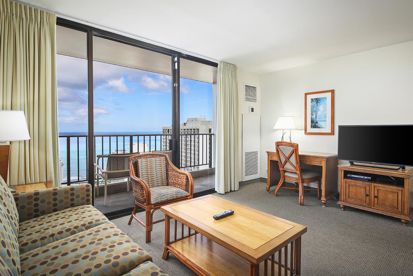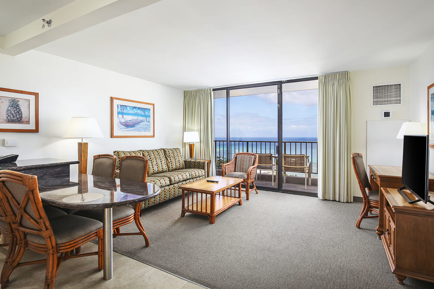 Offering an impressive view of Diamond Head and the Pacific Ocean, these two-bedroom suites are located on floors 25-37. Suite features one bathroom, a living area, full kitchen, and private balcony.