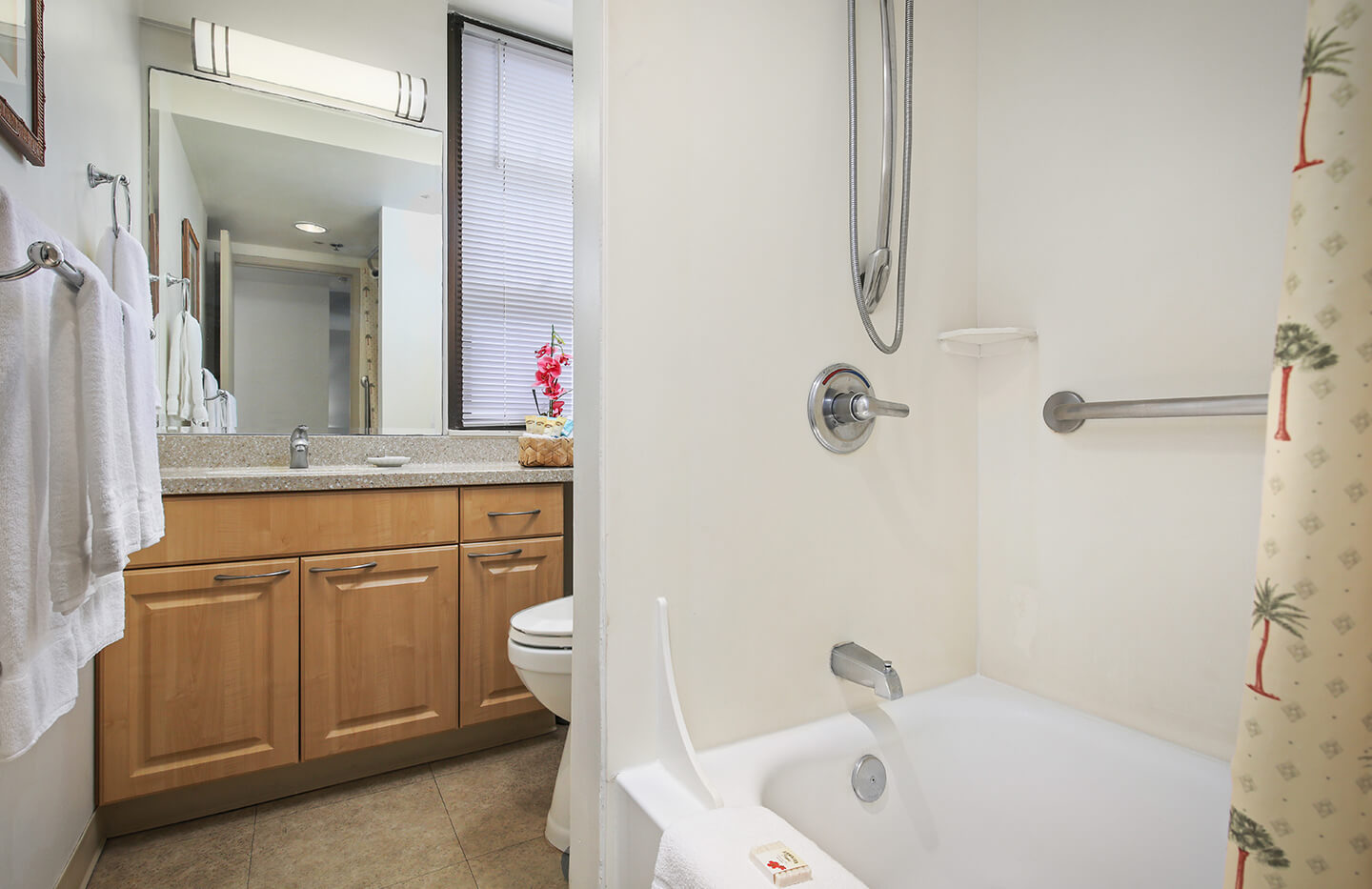Enjoy partial ocean views from these one bedroom suites, located on floors 15-24. Suite features one bathroom, a living area, full kitchen, and private balcony.
