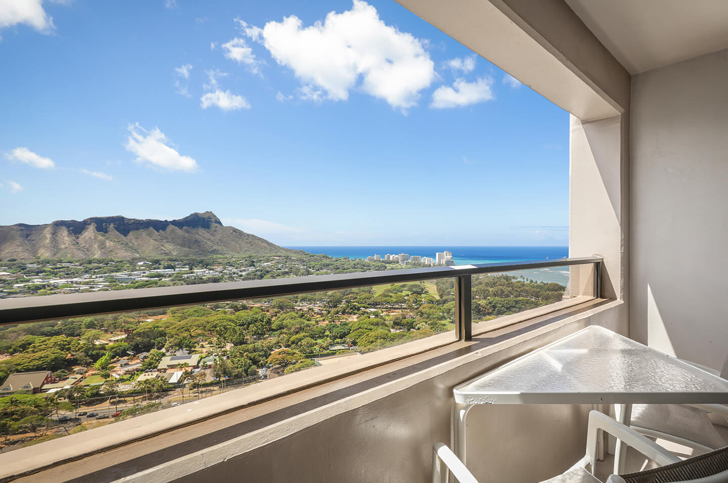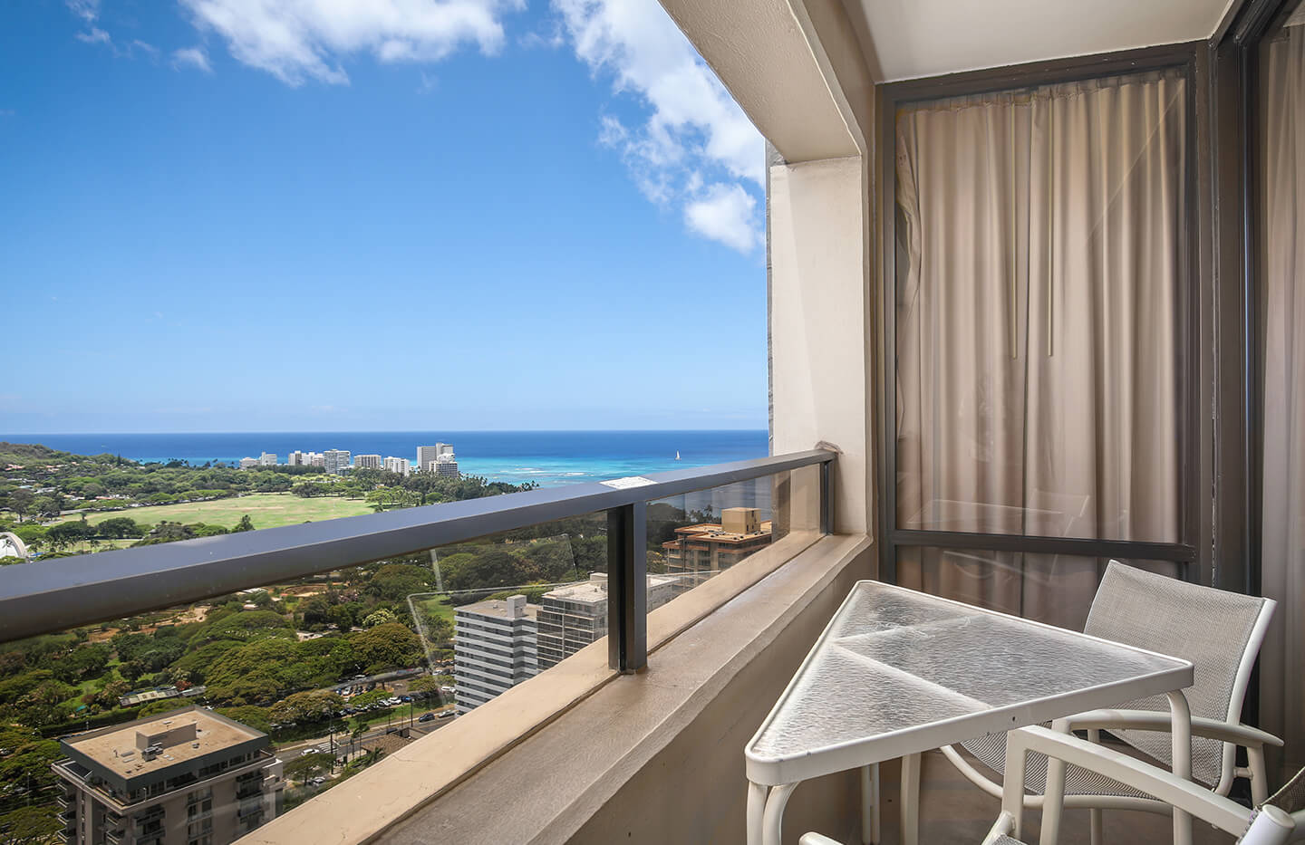 These two-bedroom suites located on floors on 25-37 offer partial views of the Pacific Ocean and Diamond Head. Suite features one bathroom, a living area, full kitchen, and private balcony.