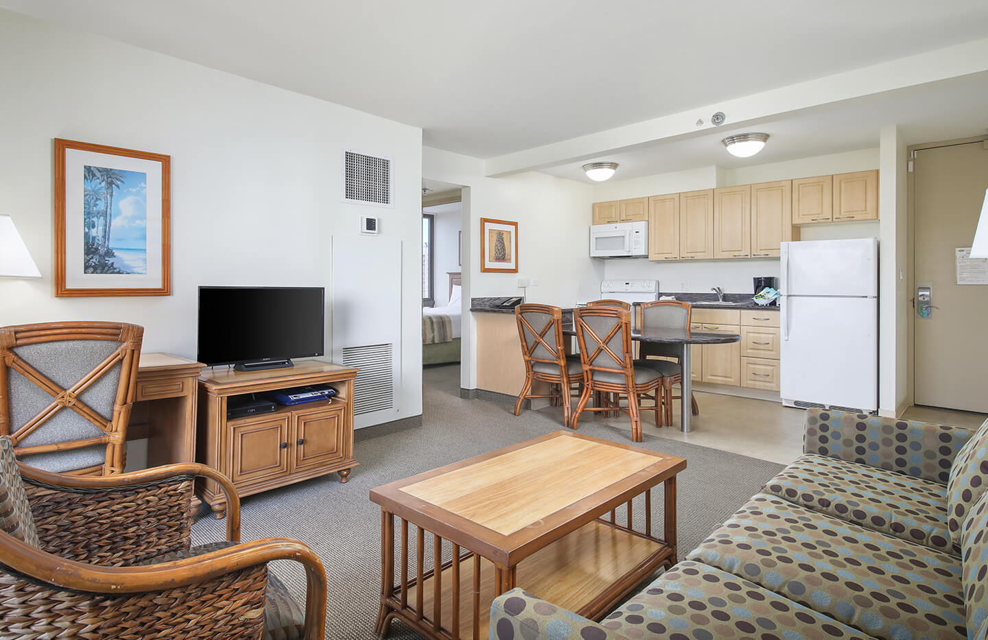Relax in these deluxe suites located on floors 25-37 with beautiful views of the Pacific Ocean. Suite features one bedroom, one bathroom, a living area, full kitchen, and private balcony.