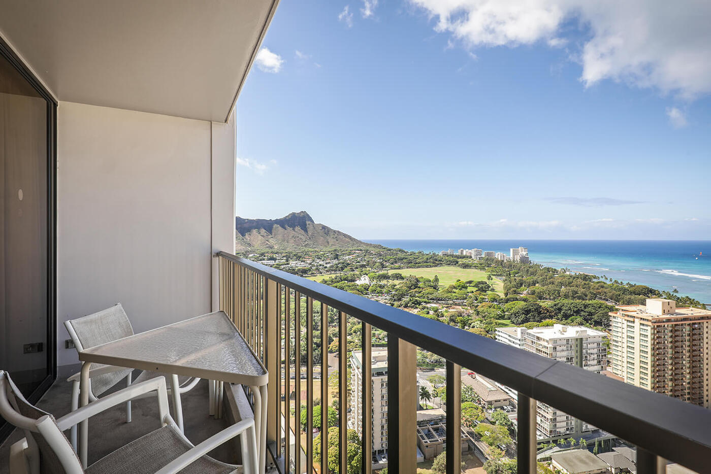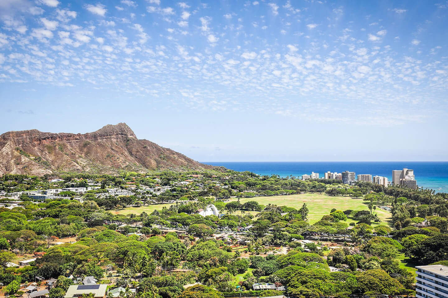 View of Diamond Head Crater and Kapiolani Park with the Pacific Ocean in the horizon