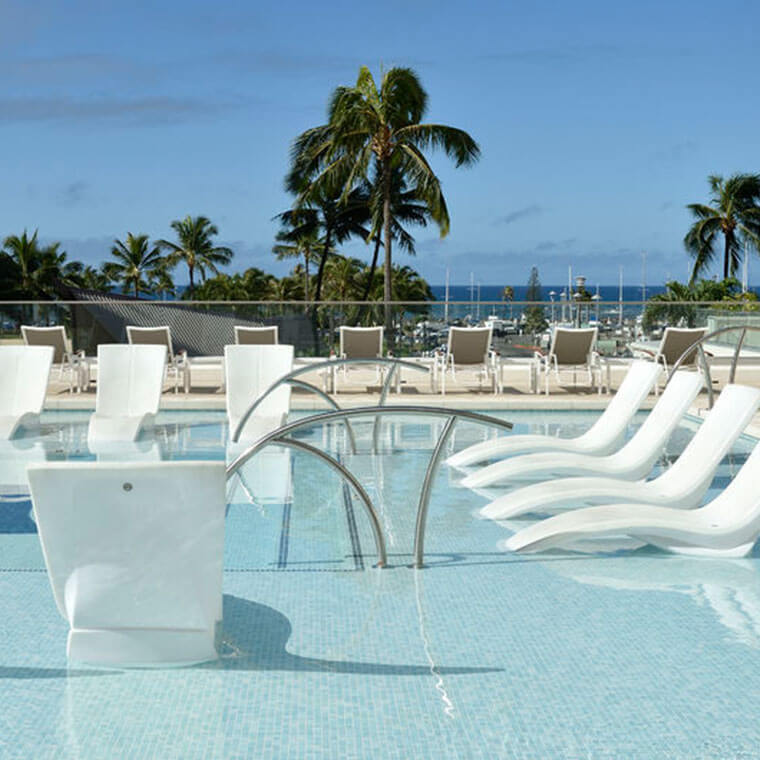- The hotel has two pools—one of which features partially submerged lounge chairs.