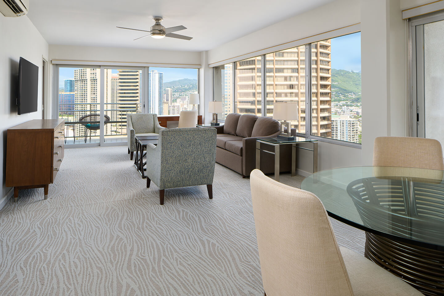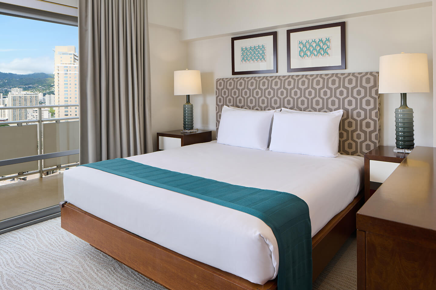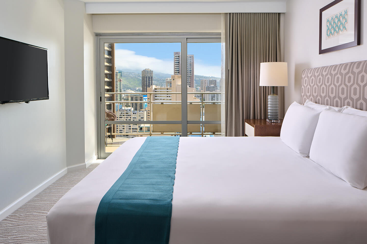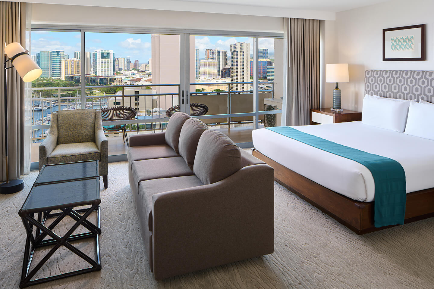 This junior suite offers views overlooking Ala Moana Boulevard. Suite features a full gourmet kitchen, seating area with a queen sofa bed, and private balcony.