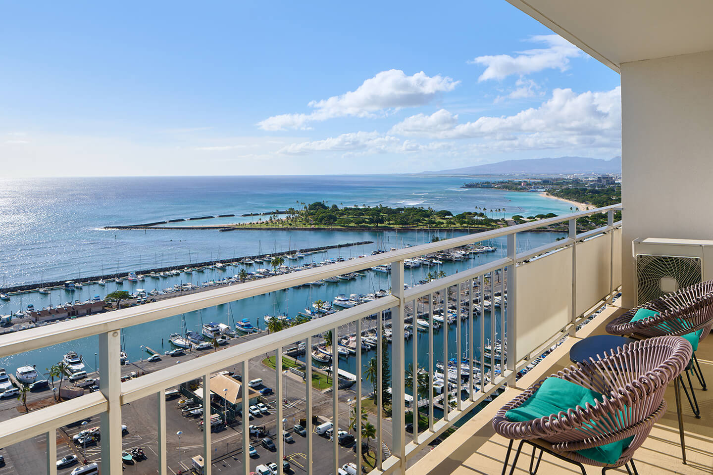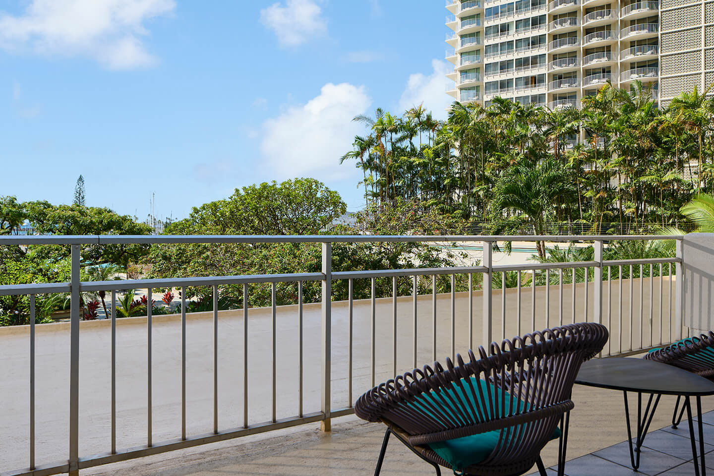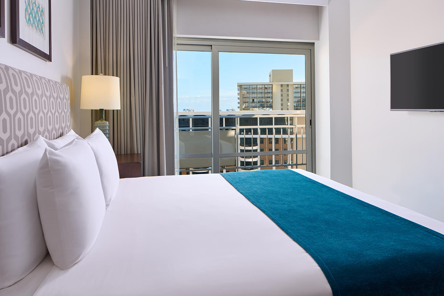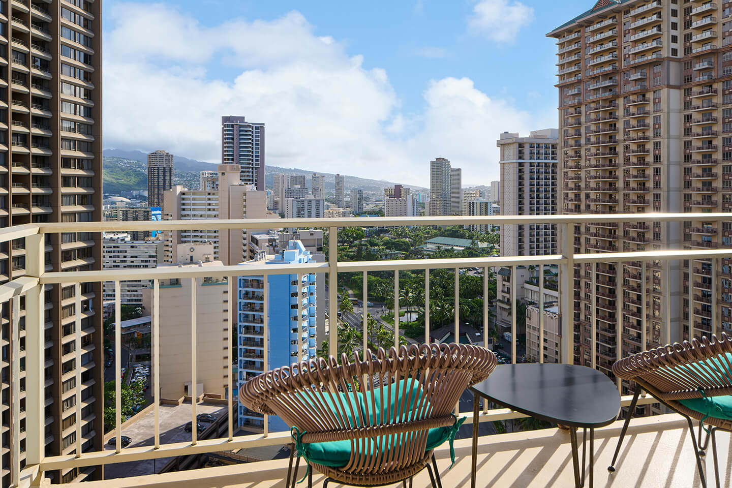This junior suite offers views overlooking Ala Moana Boulevard. Suite features a full gourmet kitchen, seating area with a queen sofa bed, and private balcony.