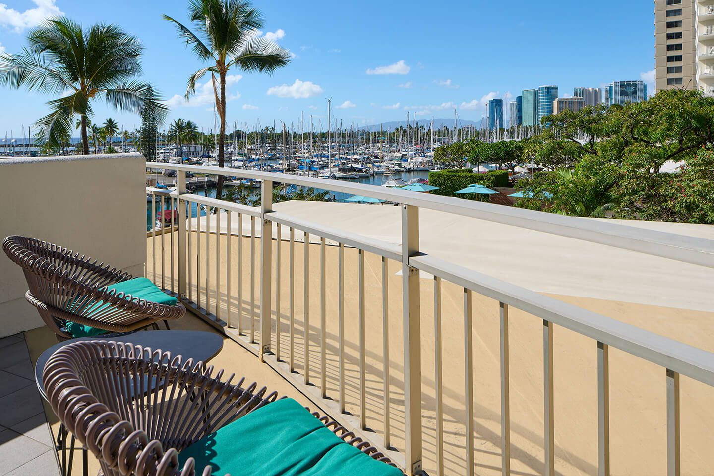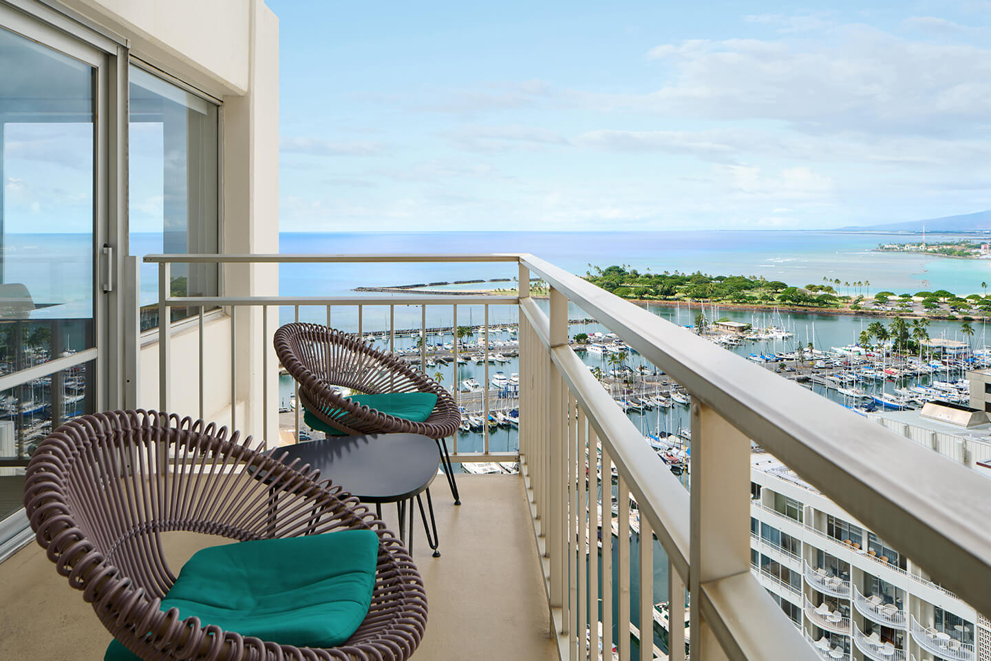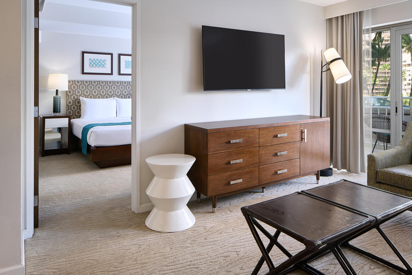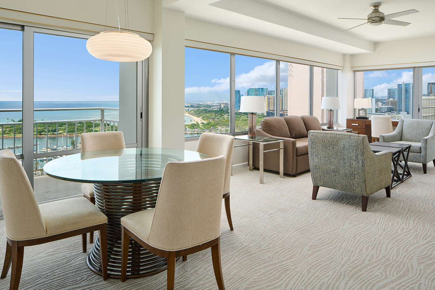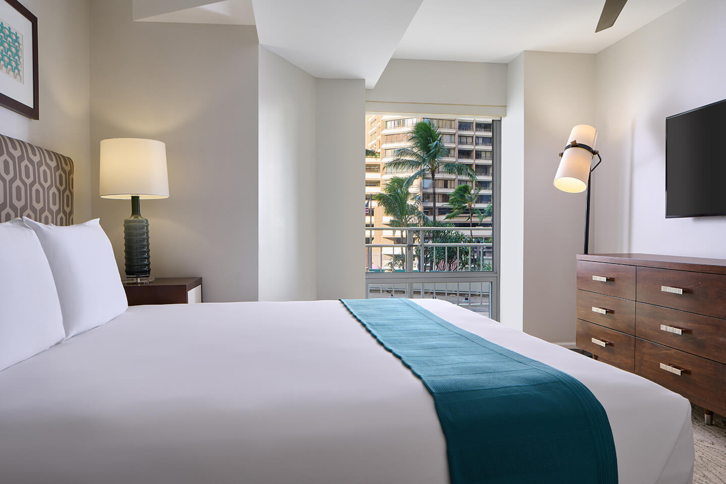 This junior suite offers views overlooking Ala Moana Boulevard. Suite features a full gourmet kitchen, seating area with a queen sofa bed, and private balcony.