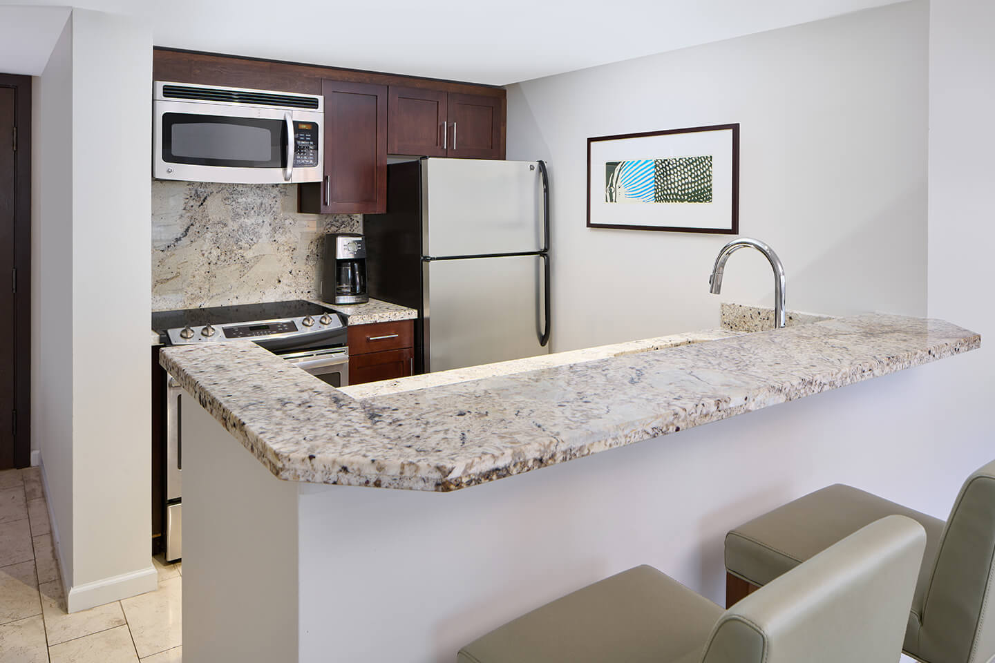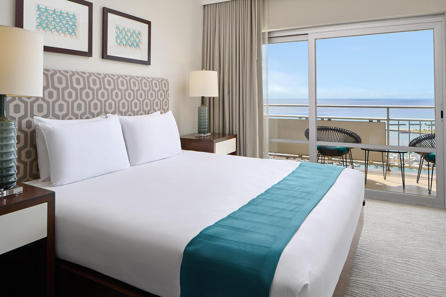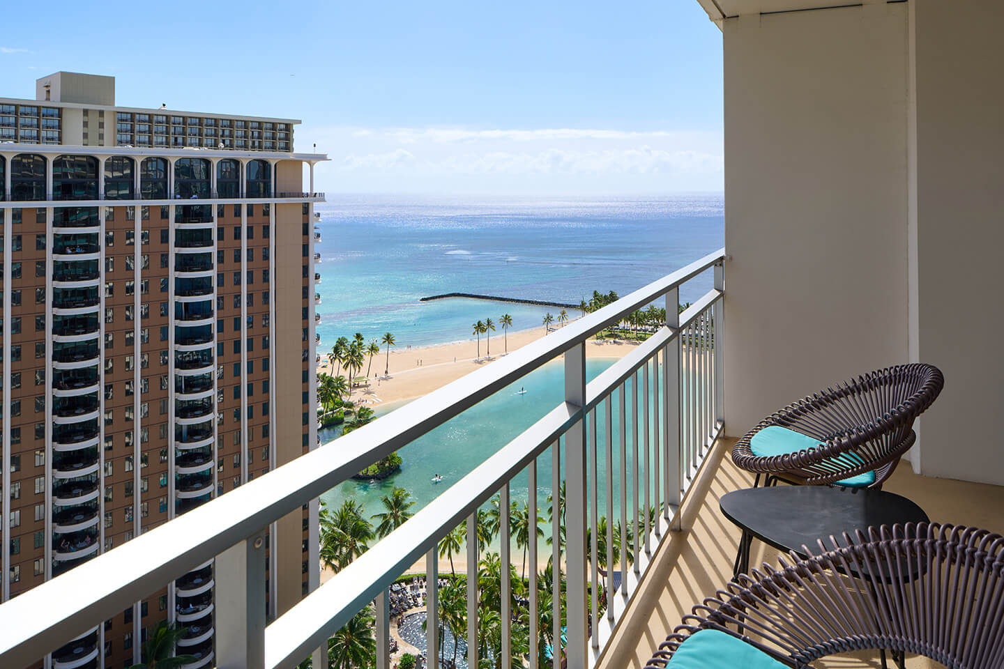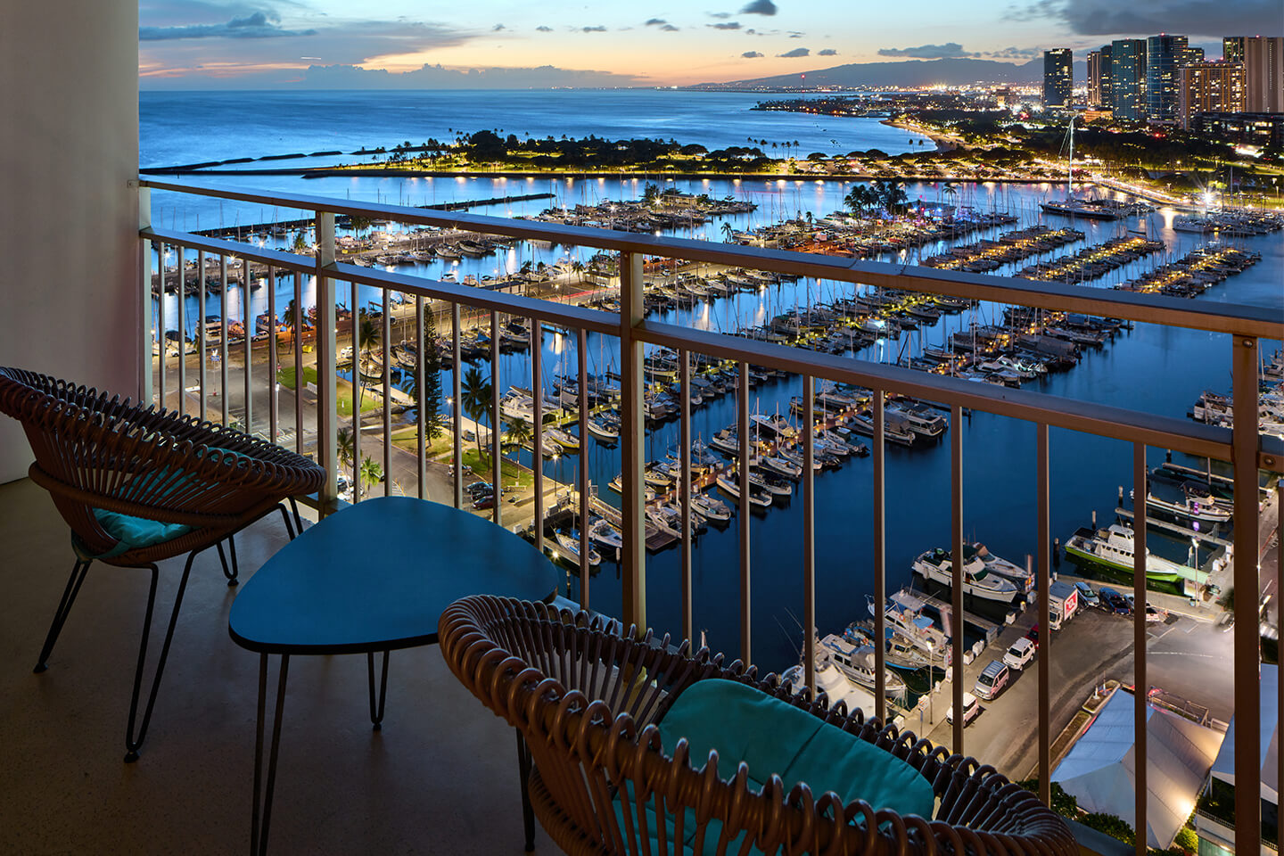 This junior suite offers views overlooking Ala Moana Boulevard. Suite features a full gourmet kitchen, seating area with a queen sofa bed, and private balcony.