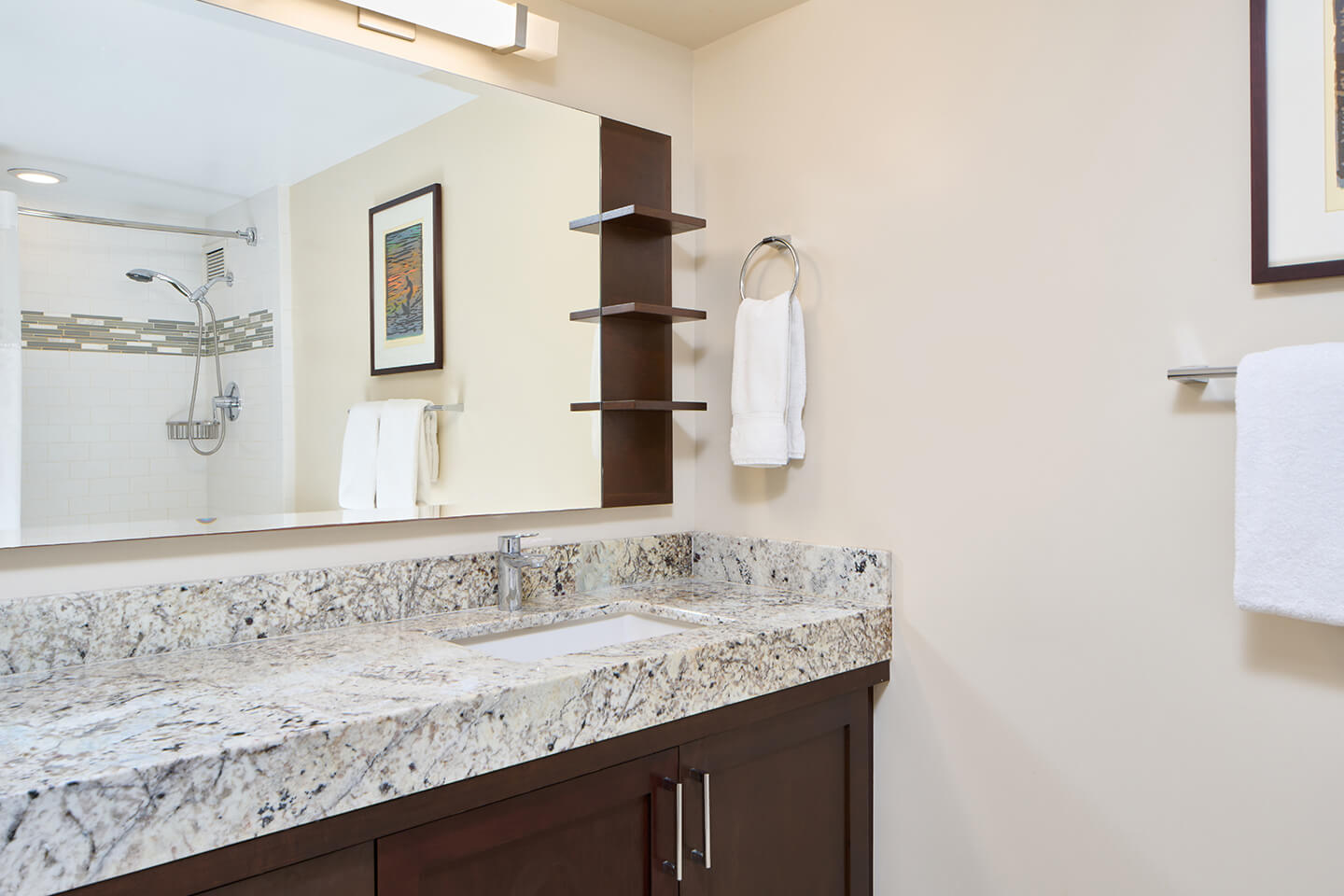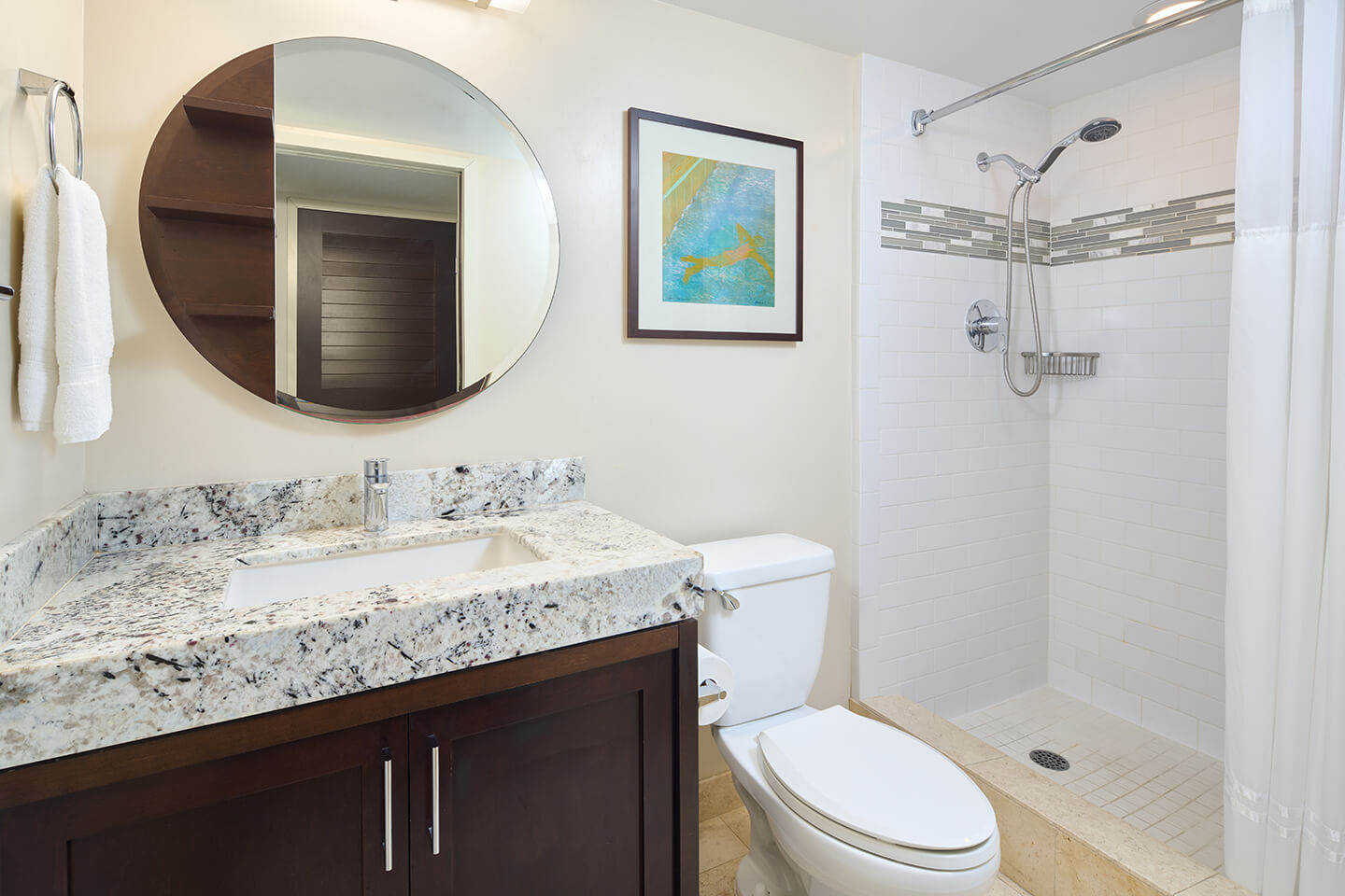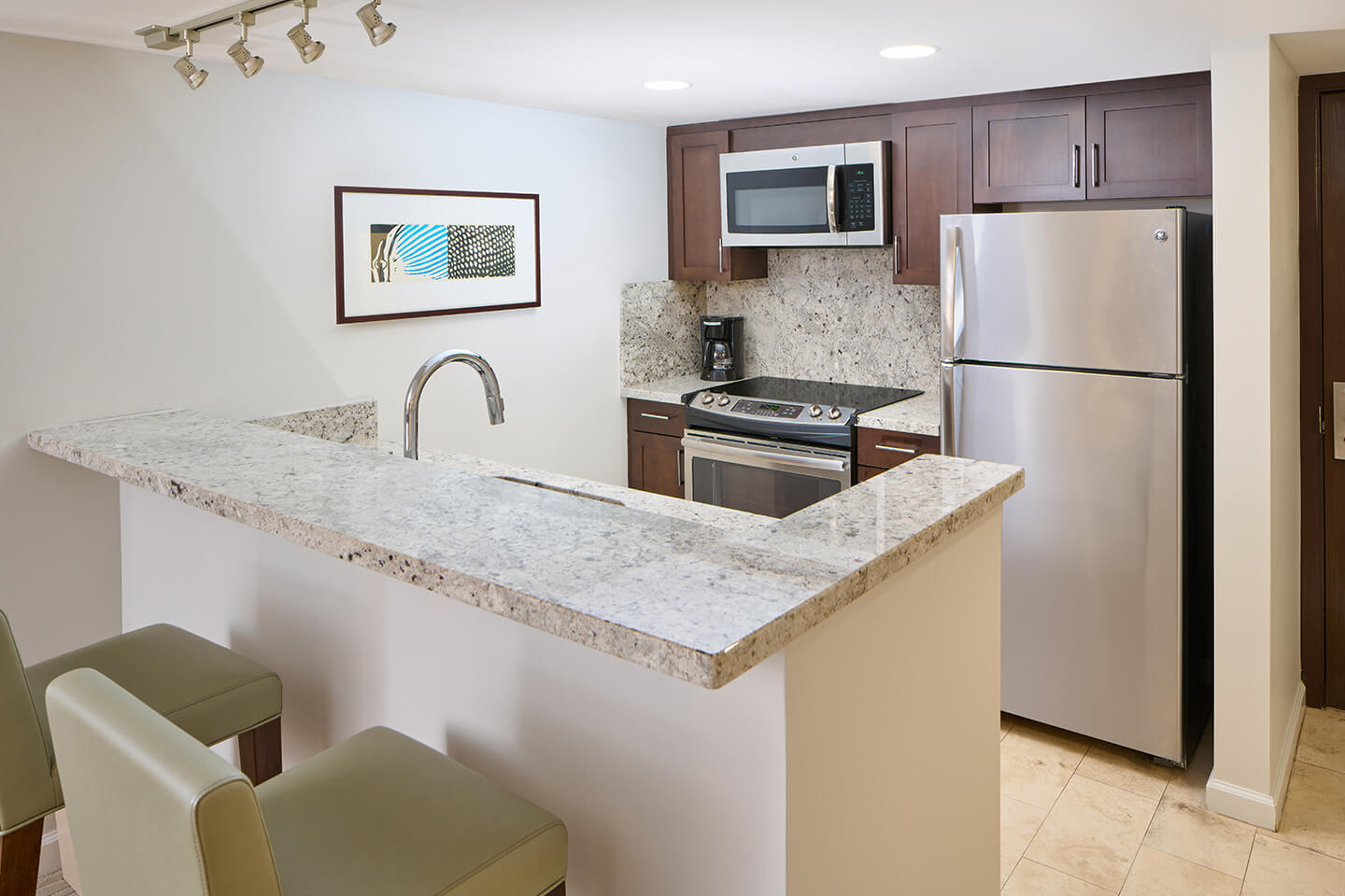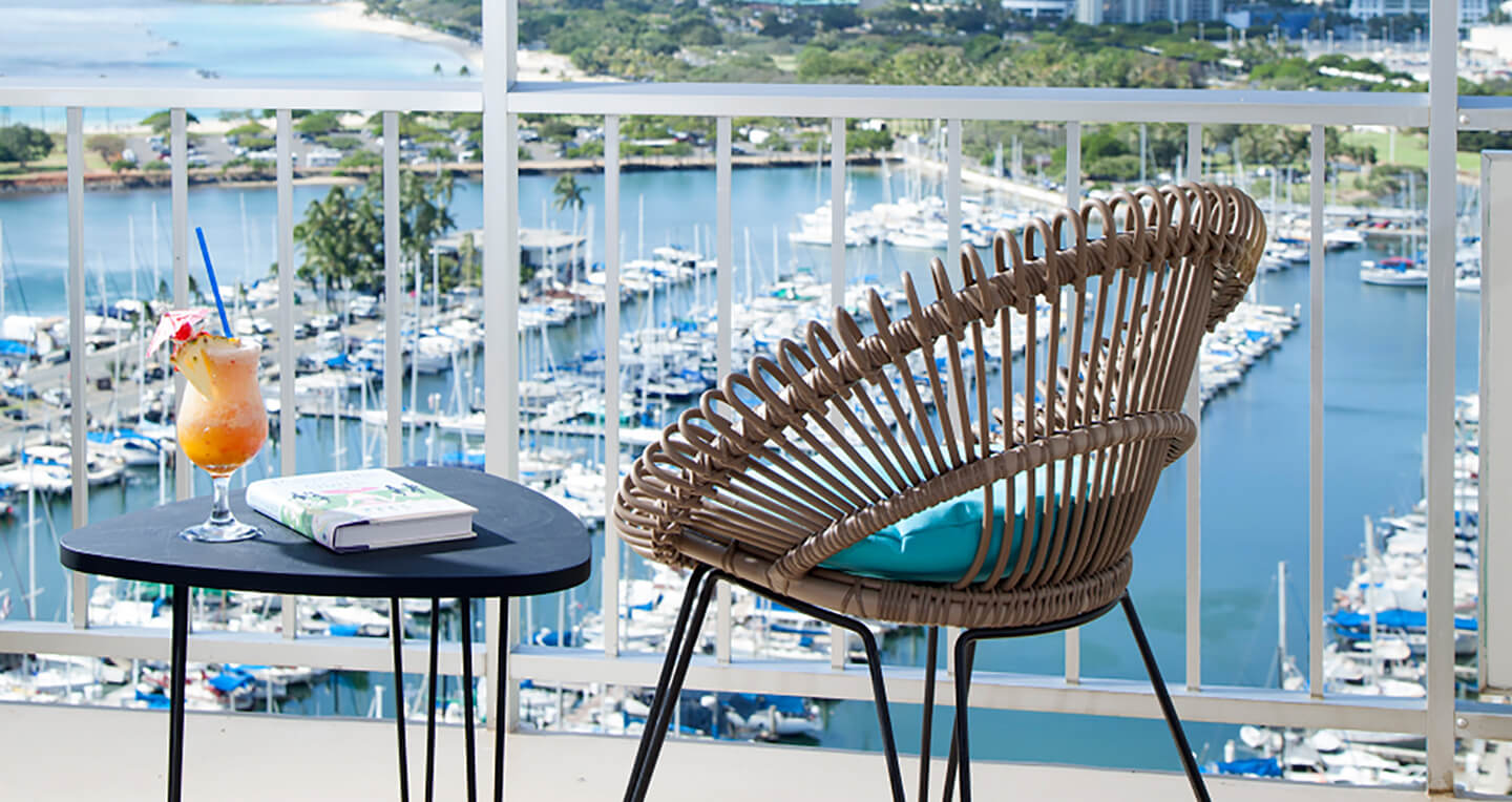 This junior suite offers views overlooking Ala Moana Boulevard. Suite features a full gourmet kitchen, seating area with a queen sofa bed, and private balcony.