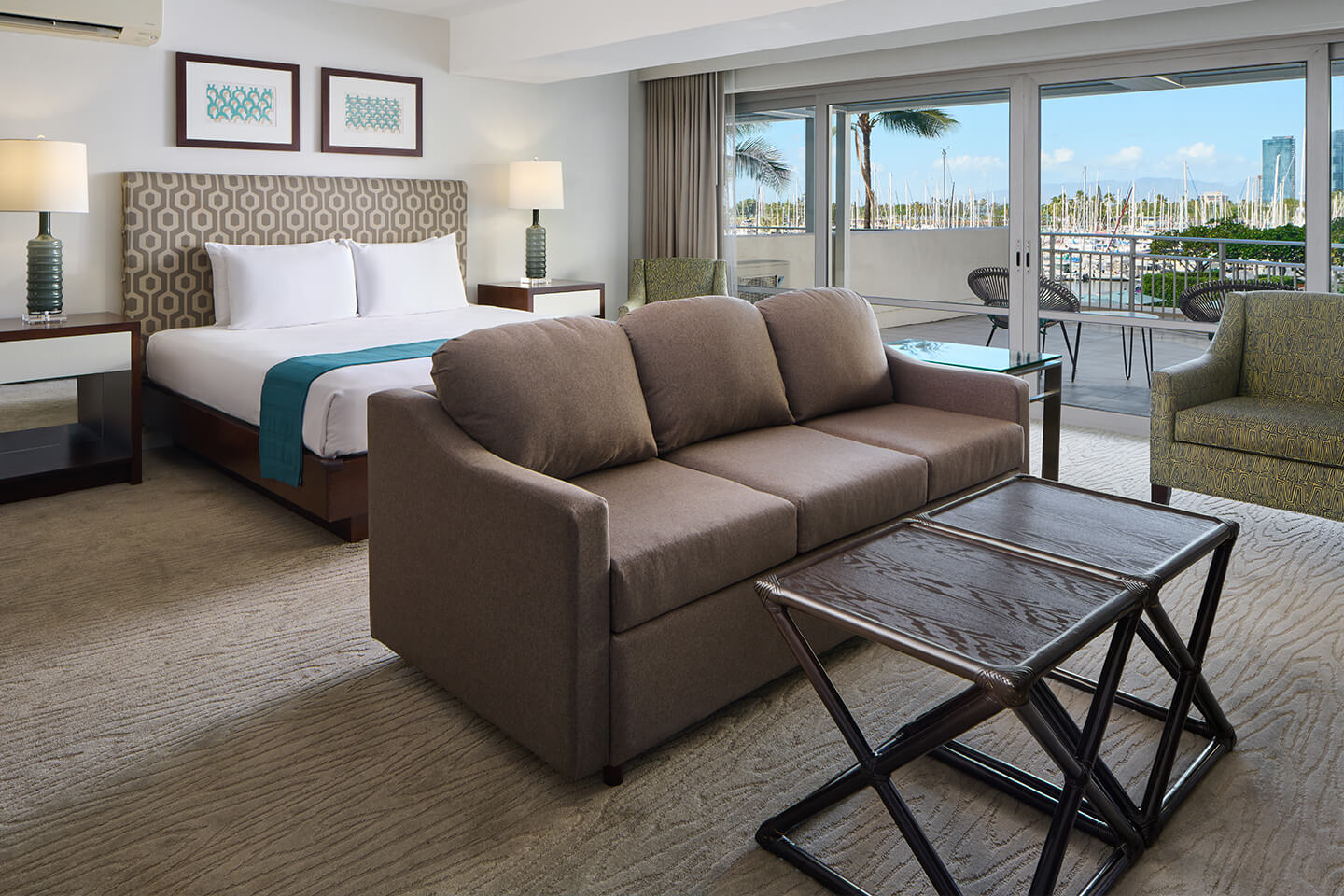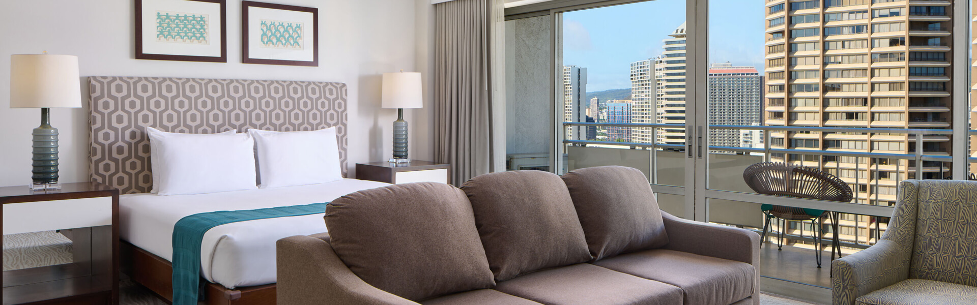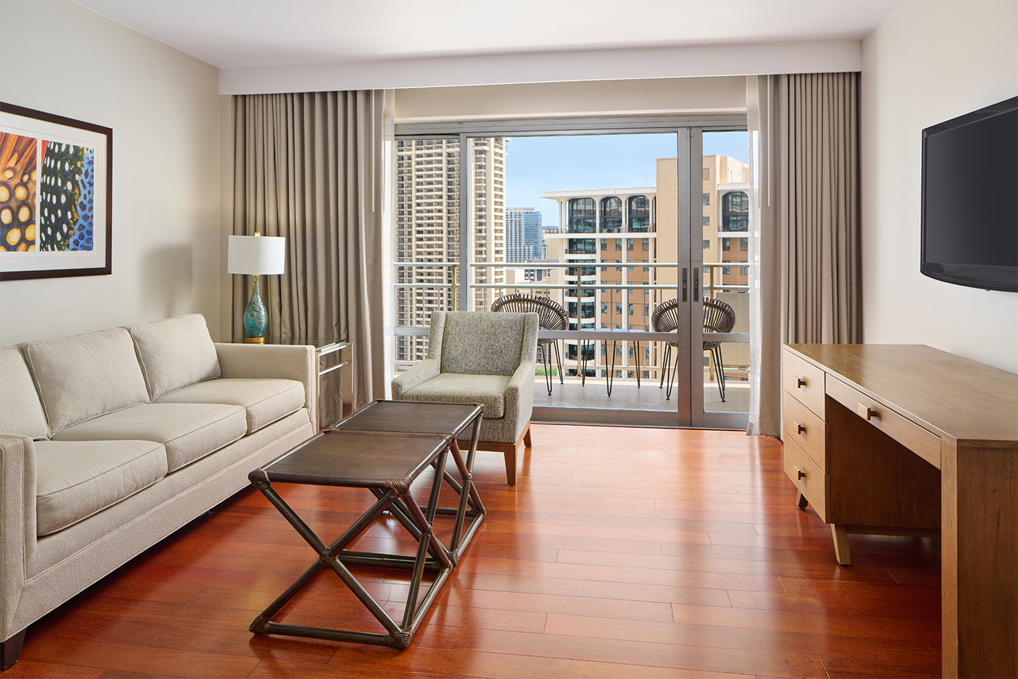 Spread out in this one bedroom suite that offers a separate living area with a queen sofa bed and relaxing views that overlook Duke Kahanamoku Lagoon and extend to the Pacific Ocean. Suite also features a full gourmet kitchen and private balcony.
